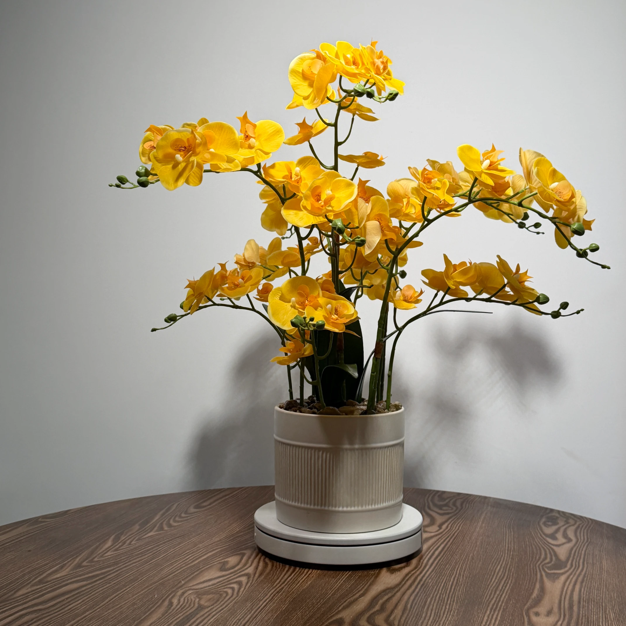 This stunning artificial orchid arrangement features multiple lush, arching stems of vibrant sunny golden-yellow Phalaenopsis (moth orchid) blooms with delicate orange centers, creating a full, abundant display. Complete with realistic dark green leaves, unopened buds, and decorative pebbles at the base, this hyper-realistic arrangement requires no maintenance, watering, or sunlight. Potted in a modern beige ribbed ceramic planter with a sleek, textured finish, it adds a bright, cheerful, luxurious touch to living rooms, dining tables, offices, or serves as a thoughtful housewarming gift.