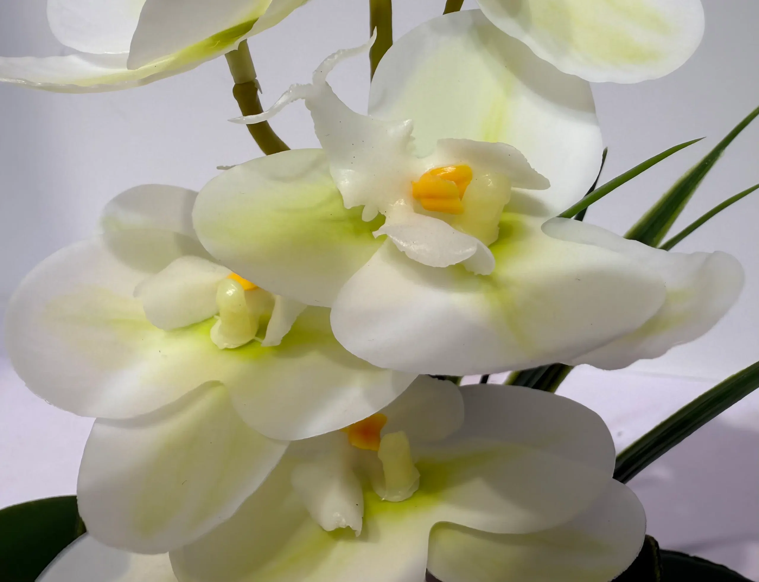 Supple warm white orchid arrangement in new trend arrival. A stunning Off-White Orchid Floral Arrangement arranged in 28cm height, with cement pot(can be custom).