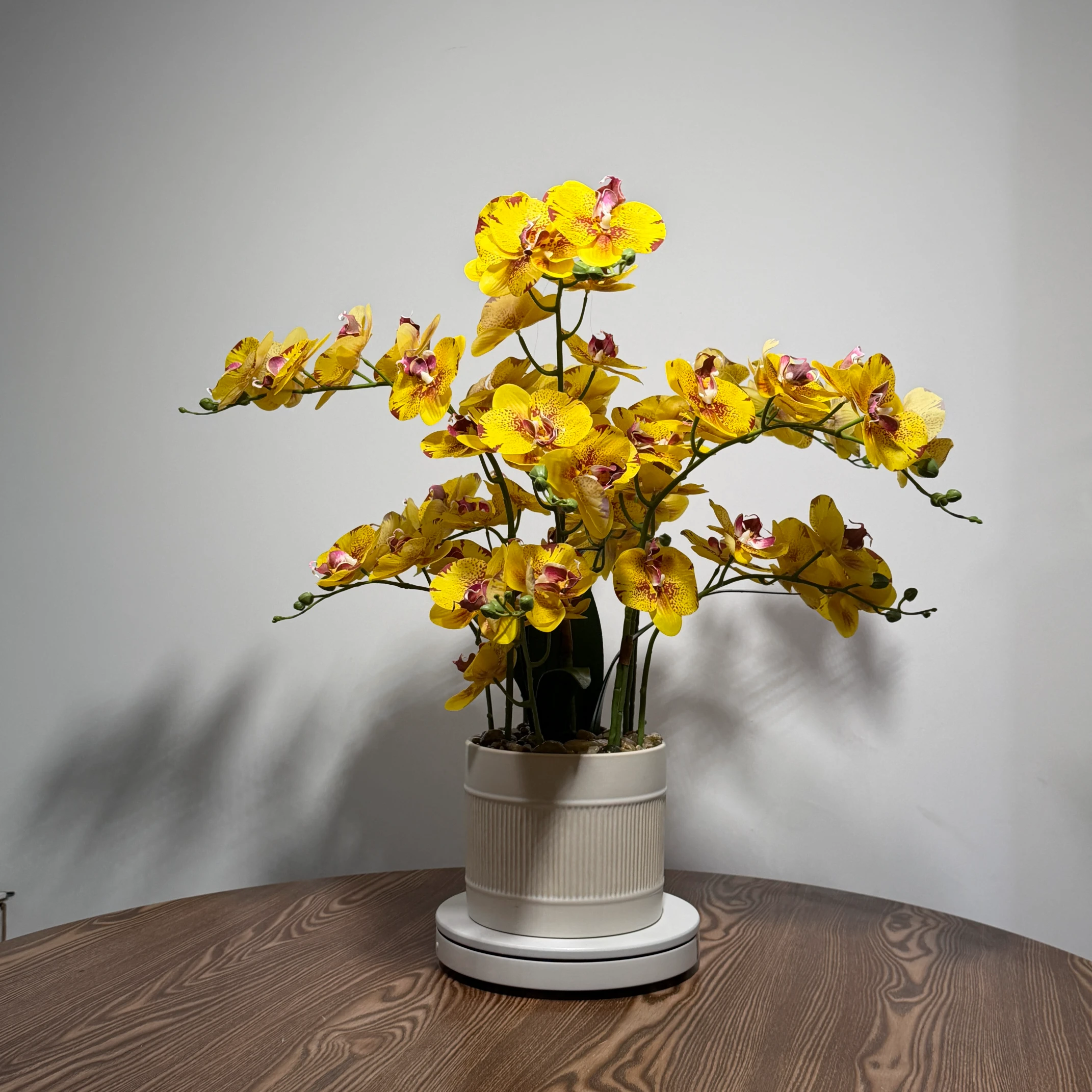 This showstopping artificial orchid arrangement features multiple lush, arching stems of vibrant golden-yellow Phalaenopsis (moth orchid) blooms, adorned with intricate pink-red spotted centers and delicate magenta lip accents. Complete with realistic dark green leaves, unopened buds, and decorative pebbles at the base, this hyper-realistic arrangement requires no maintenance, watering, or sunlight. Potted in a modern beige ribbed ceramic planter with a sleek, textured finish, it adds a bold, tropical, luxurious touch to living rooms, dining tables, offices, or serves as a stunning housewarming gift.