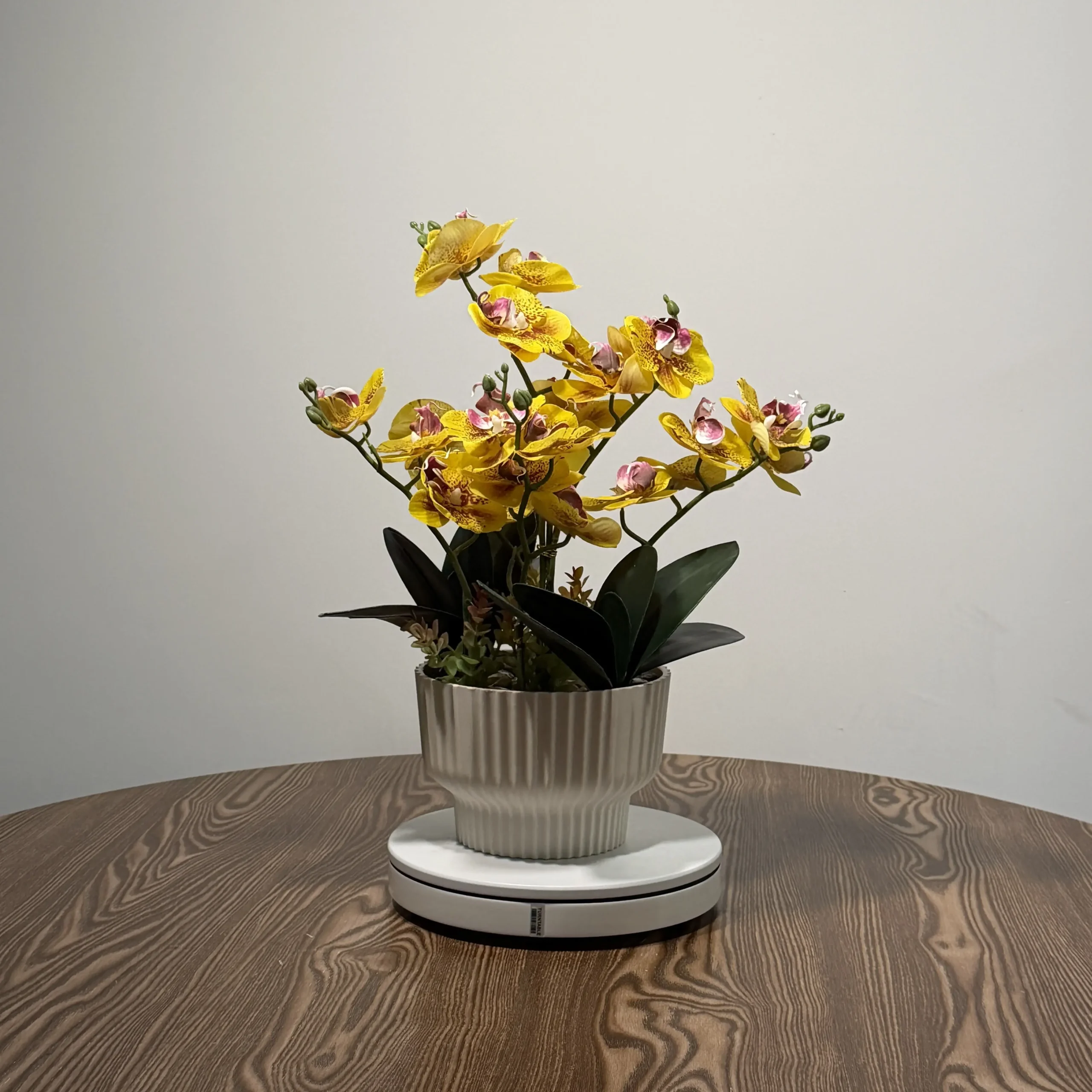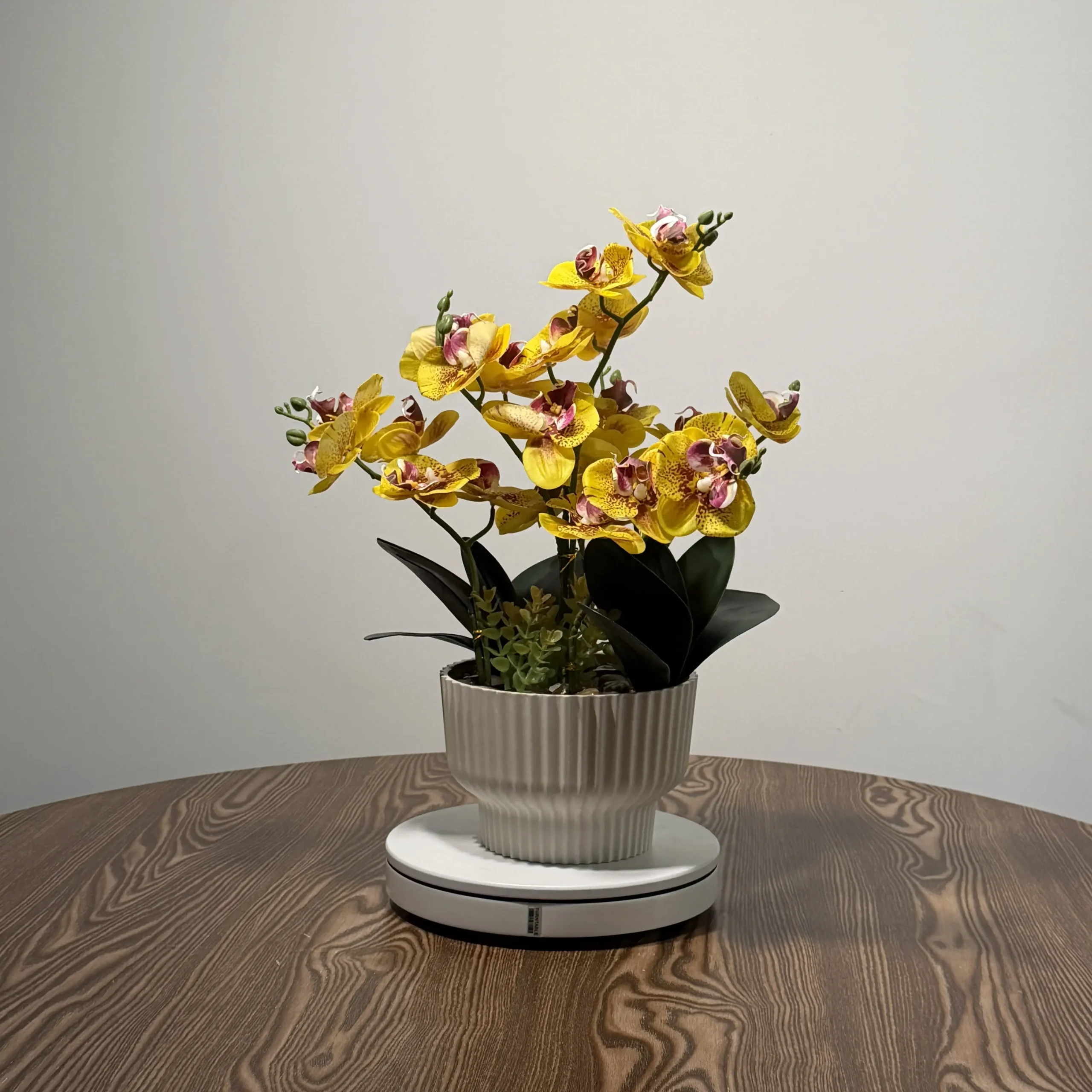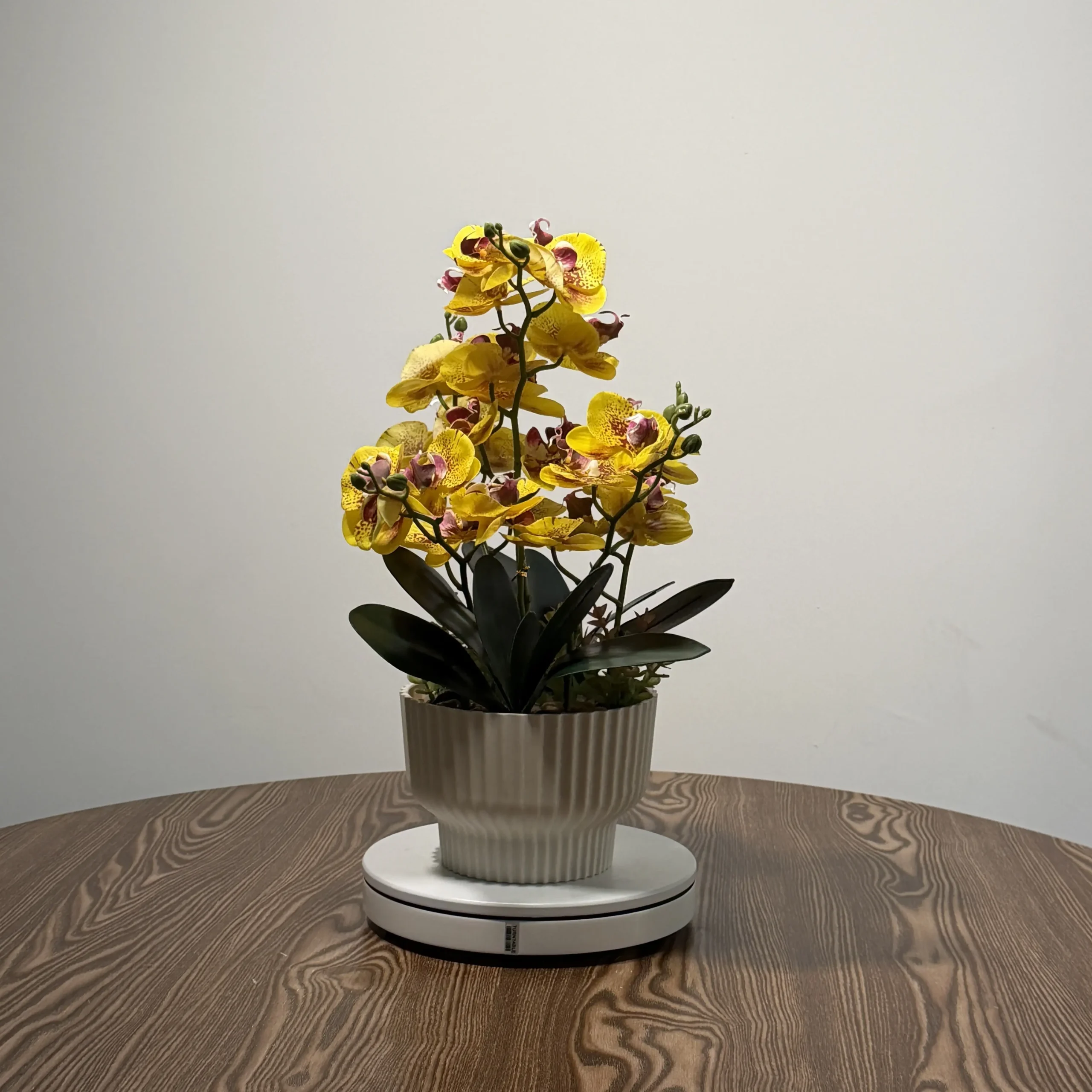 This stunning artificial orchid arrangement features multiple lush stems of vibrant yellow Phalaenopsis (moth orchid) blooms with intricate pink/purple spotted centers and delicate magenta lip accents, complete with realistic dark green leaves and unopened buds. Potted in a modern silver ribbed ceramic planter with a sleek, textured finish, this zero-maintenance decor requires no watering, pruning, or sunlight. Perfect for adding a luxurious, tropical touch to living rooms, dining tables, offices, or as a statement centerpiece.