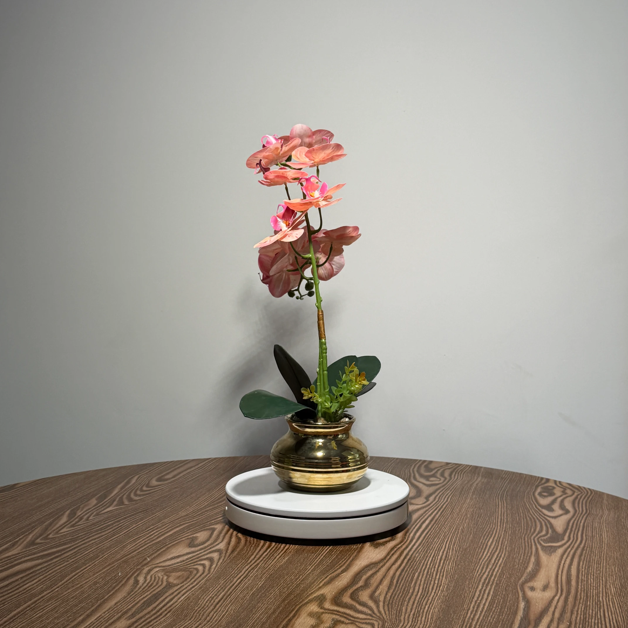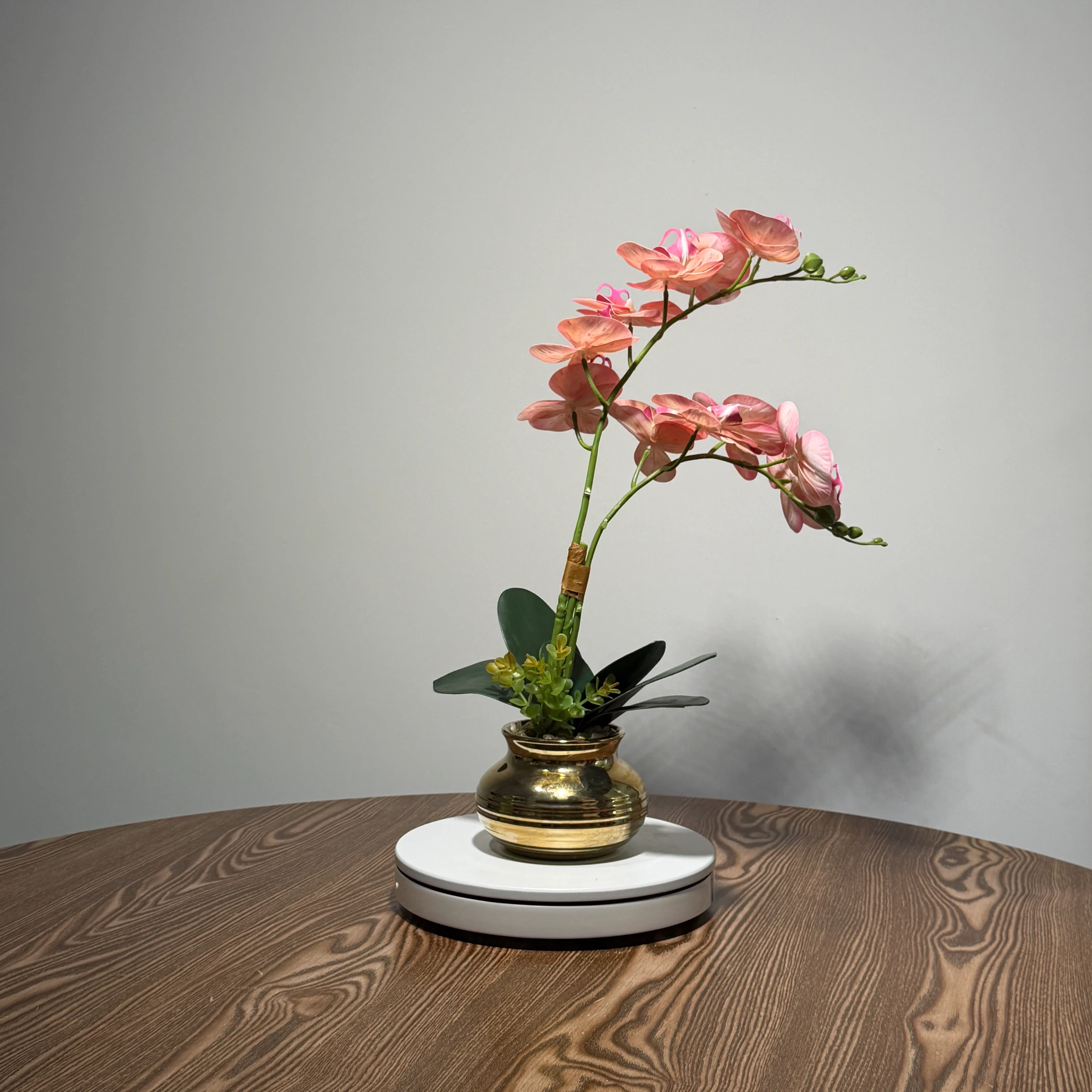 This stunning artificial orchid arrangement features a single elegant stem of delicate peach-pink Phalaenopsis (moth orchid) blooms with marbled gradient petals and vibrant magenta-pink lip accents, complete with realistic dark green leaves, unopened buds, and subtle decorative foliage. Potted in a premium hammered gold ceramic vase with a sleek, reflective finish, this zero-maintenance decor requires no watering, pruning, or sunlight. Perfect for adding a romantic, warm, luxurious touch to living rooms, dining tables, entryways, offices, or as a statement centerpiece.