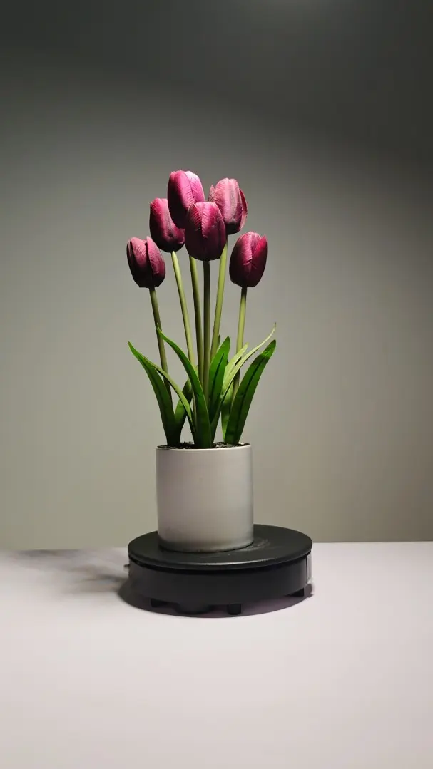 Supple premium artificial potted flowers in new trend arrival. A stunning Artificial Purple Tulips , arranged in 35cm height, with White Ceramic Pot (Customization Available).
