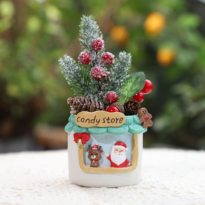 • Candy Store Planter: A candy shop window with Santa and reindeer, adorned with frosted red berry branches