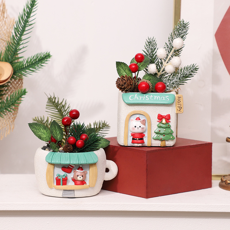 • Bear Mug Planter: A mug-shaped shop with a bear in a Santa hat, paired with lush pine and red berries