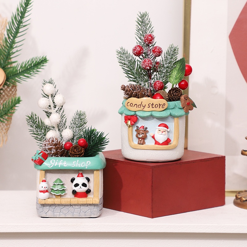• Gift Shop Planter: A gift shop window with panda, snowman, and bear accents, filled with frosted pine and white berries