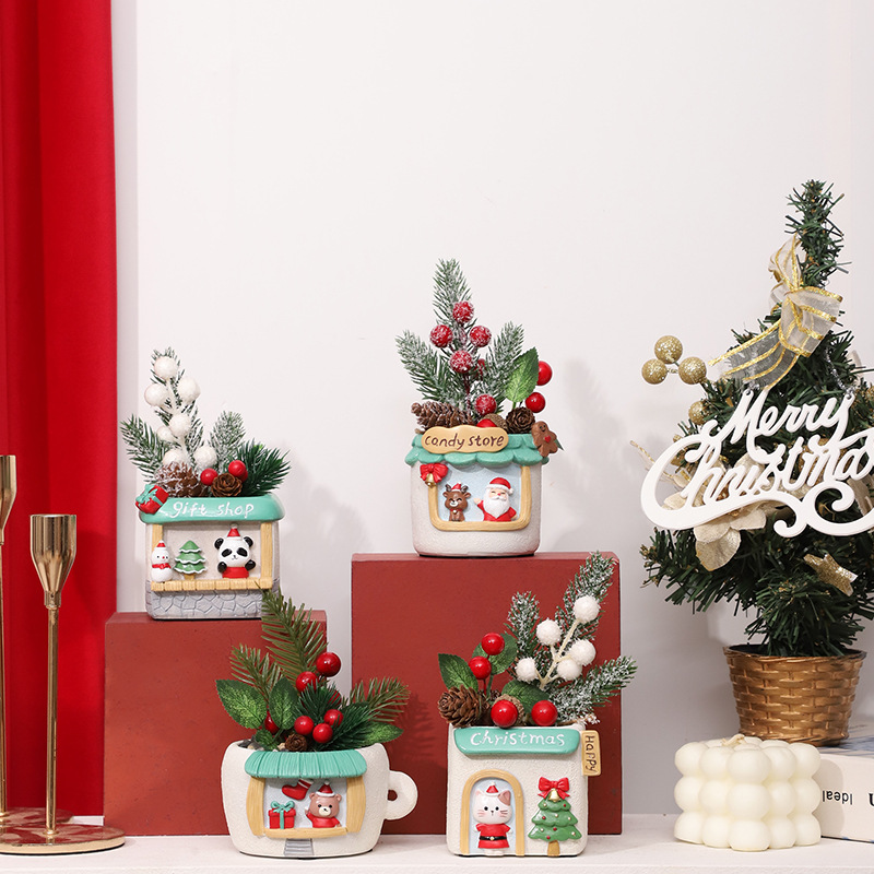 Bring whimsical, festive charm to your holiday decor with this adorable 4-piece Christmas shop-themed planter collection. Each hand-painted resin planter is designed as a cute holiday shop, paired with pre-arranged artificial pine, vibrant red/white berry clusters, and natural pinecones for a full, cheerful look. The set includes four unique designs: