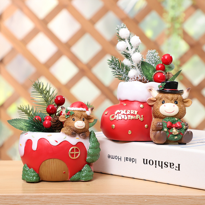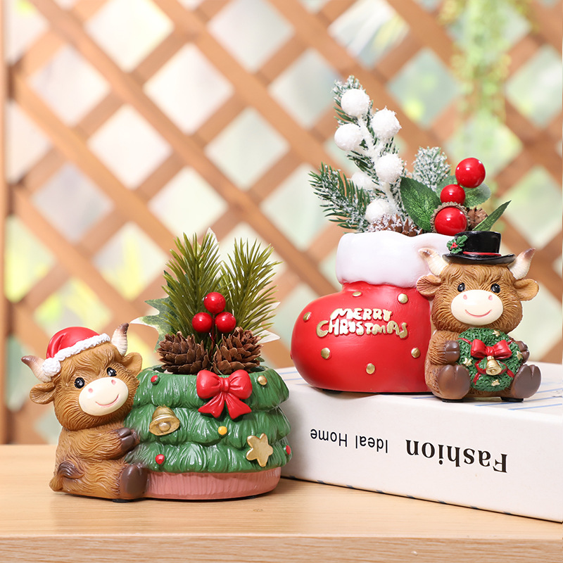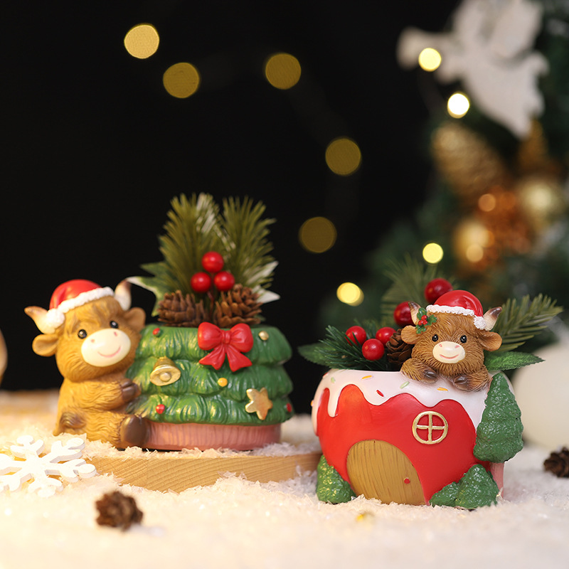 • Green Christmas Tree Planter: A small highland cow in a Santa hat, in a tree-shaped pot with a red bow and gold bell accents