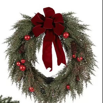 • Deep Red Velvet Bow Wreath: Textured cedar-style evergreen with a luxurious red velvet bow, paired with vibrant red berry clusters and natural pinecones