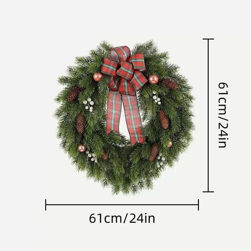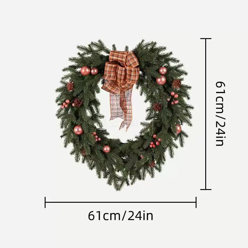 • Rose Gold Plaid Bow Wreath: Full pine branches with a rose gold plaid bow, decorated with rose gold Christmas baubles, red berries, and natural pinecones