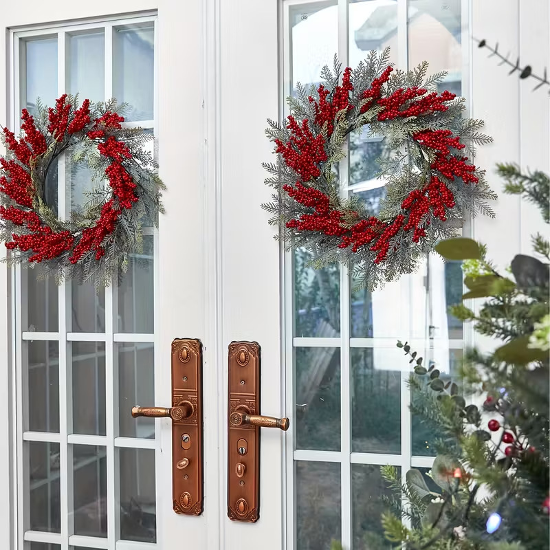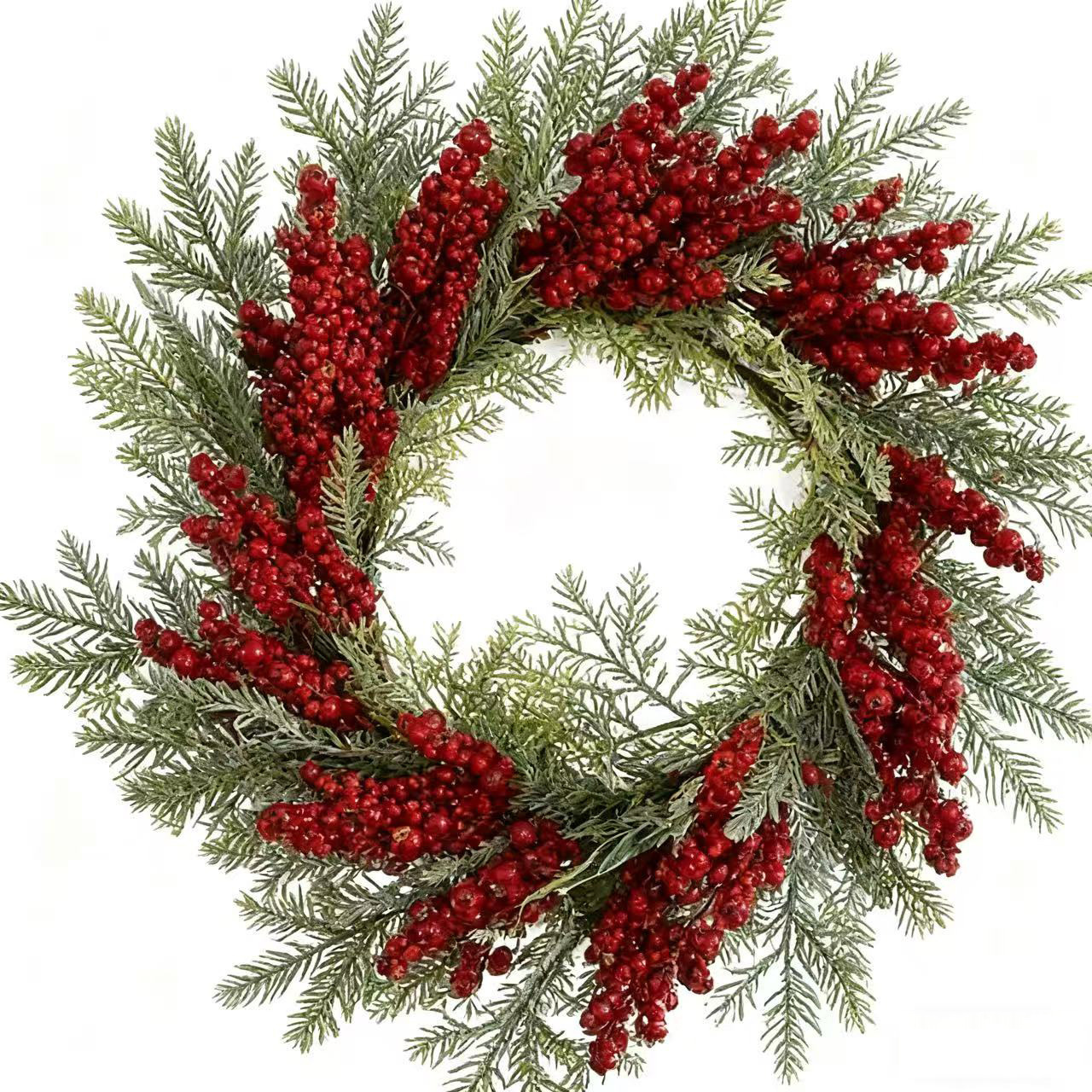 Make a striking first impression this holiday season with this elegant Christmas red berry and pine wreath collection. Handcrafted with lush, realistic artificial pine branches dusted with a snow-like flocked finish, the wreath is densely packed with vibrant clusters of red berries for a bold, festive look. This single, statement-making piece is perfect for instantly elevating your front door, mantel, or wall display. The low-maintenance, fade-resistant foliage ensures long-lasting beauty without the need for watering or upkeep.