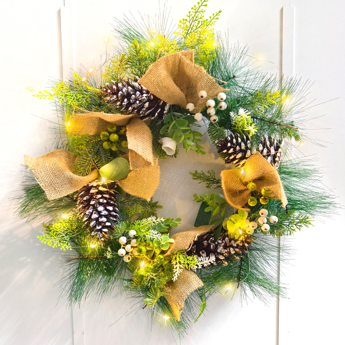 • Material: Artificial long-needle pine foliage, frosted natural pinecones, plastic berries, eucalyptus sprigs, burlap ribbon, warm white LED lights