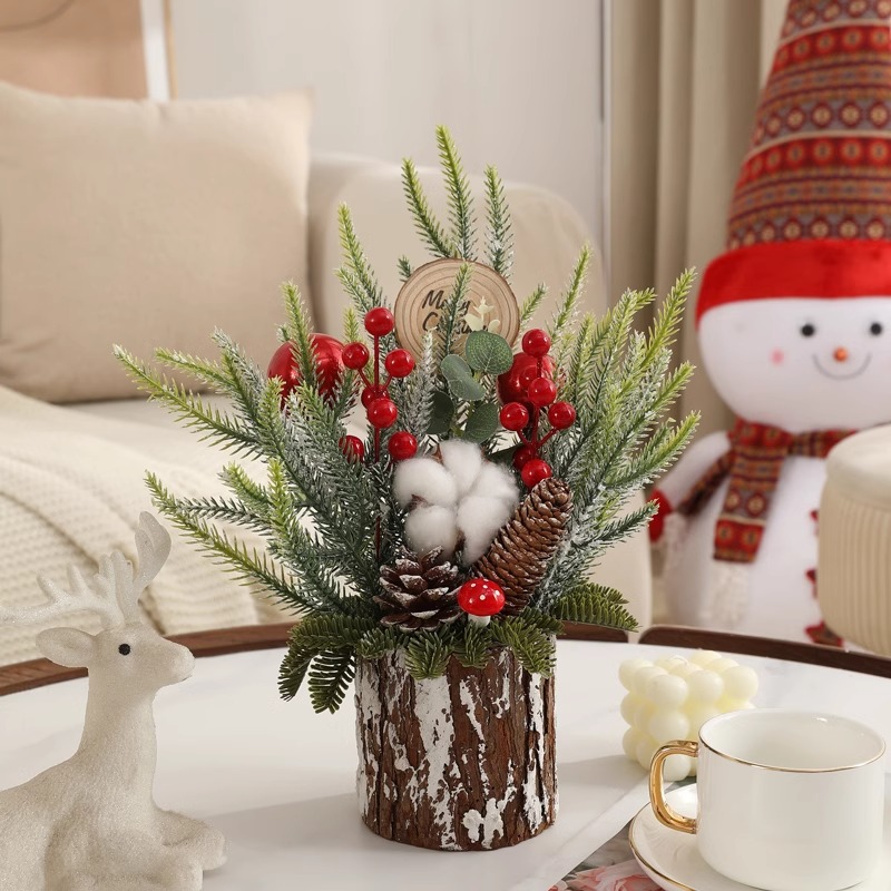 • Material: Artificial frosted pine foliage, plastic red berries, natural pinecones, cotton blossoms, faux mushroom, wooden log slice sign, faux bark vase