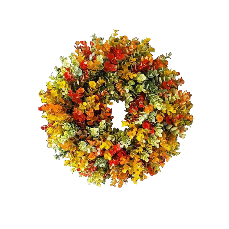 Lush and modern artificial fall wreath, handcrafted on a durable twig base. It features a dense, full arrangement of gradient eucalyptus leaves in warm autumn hues—vibrant red, burnt orange, golden yellow, and soft sage green. This minimalist yet impactful design brings effortless, year-round charm to front doors, mantels, or entryways with zero seasonal maintenance required.