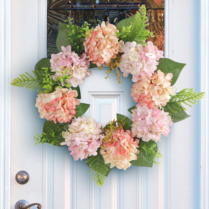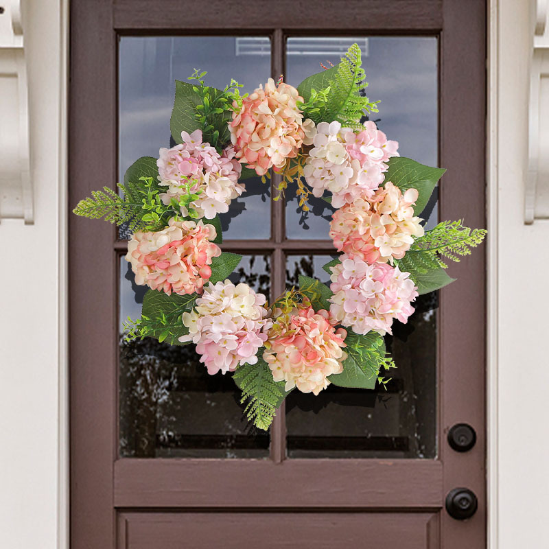 Soft and romantic artificial spring/summer wreath, handcrafted on a durable twig base. It features a lush, full arrangement of gradient pink hydrangea blooms, paired with vibrant green fern and broad leaf foliage. This dreamy, garden-inspired design brings fresh, feminine charm to front doors, mantels, or entryways with zero seasonal maintenance required.