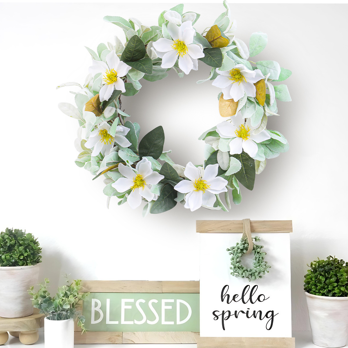 Elegant and timeless artificial year-round wreath, handcrafted on a durable natural twig base. It features a lush arrangement of lifelike white magnolia blooms with bright yellow centers, paired with soft silvery-green lambs ear foliage and mixed green leaves. This sophisticated, neutral design brings effortless modern farmhouse and cottage charm to front doors, mantels, or entryways with zero seasonal maintenance required.
