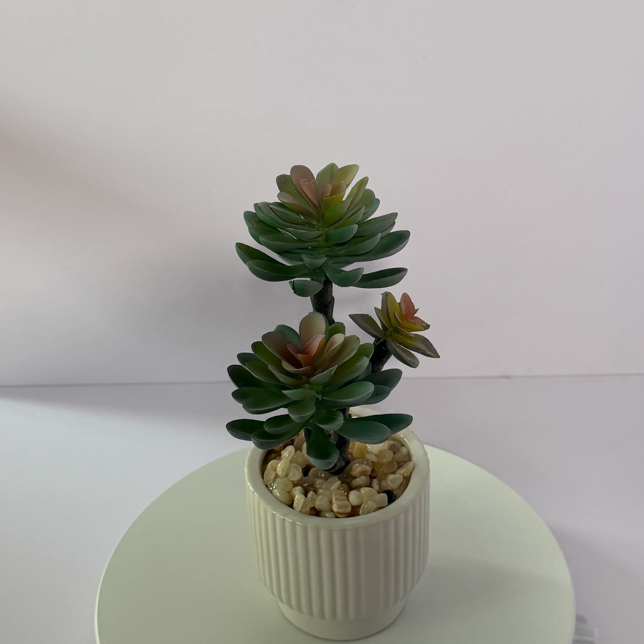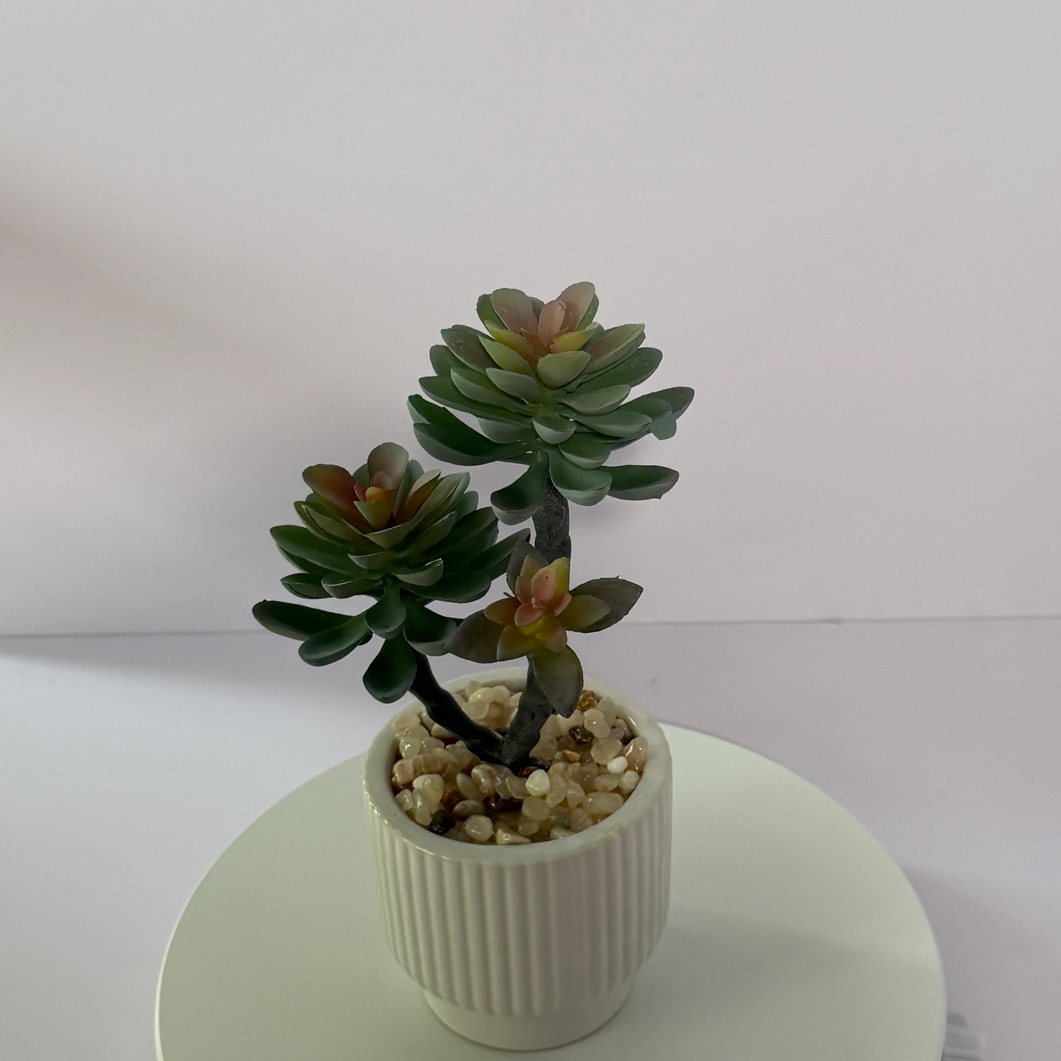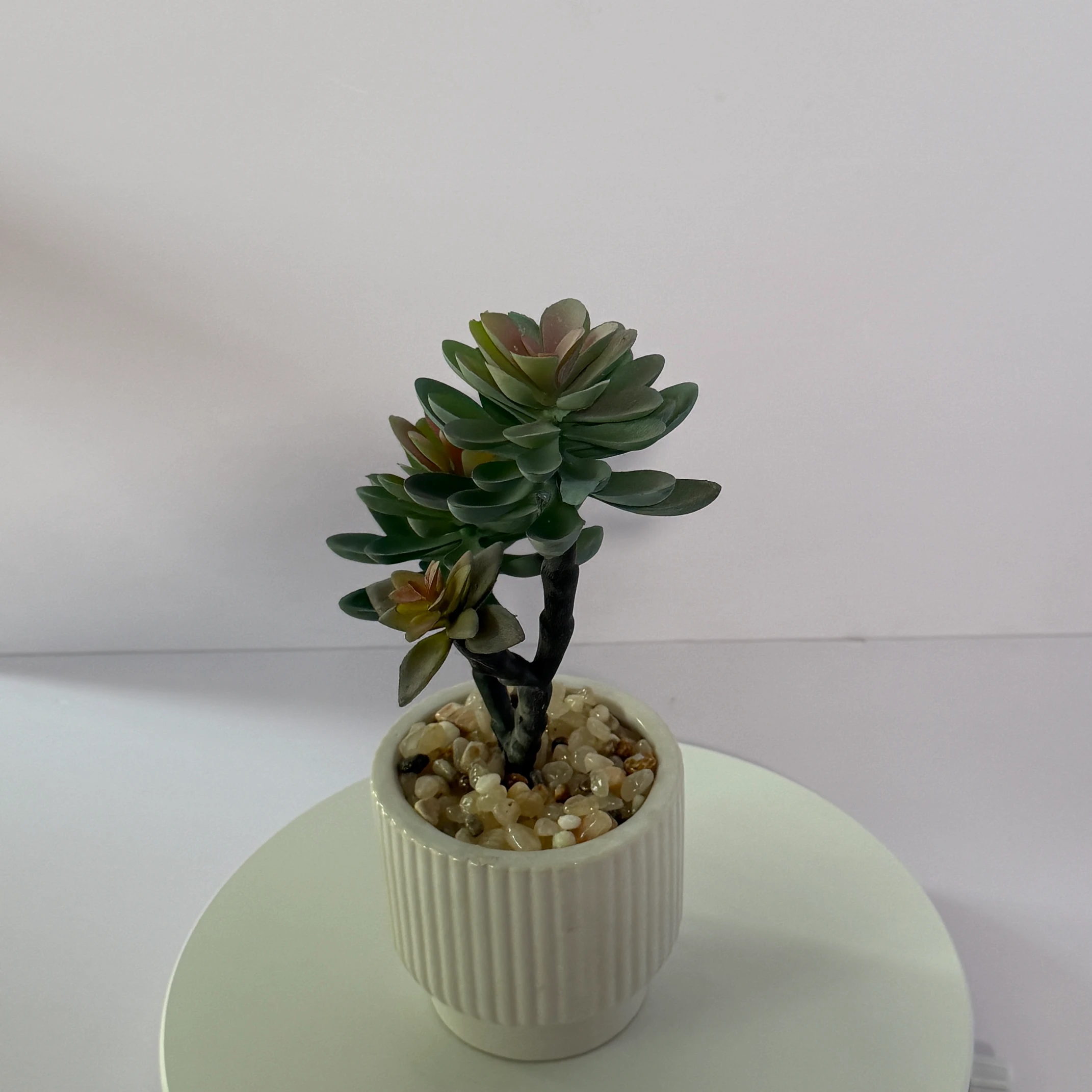 This elegant artificial succulent tree features two rosette-shaped succulents with gradient green-to-pink leaves, mounted on a dark, textured branching stem that mimics a natural bonsai. It is housed in a minimalist white ribbed ceramic pot with decorative pebbles. Fully artificial, it requires no watering, sunlight, or maintenance, bringing a sophisticated, zen-like natural touch to desks, shelves, or home corners.