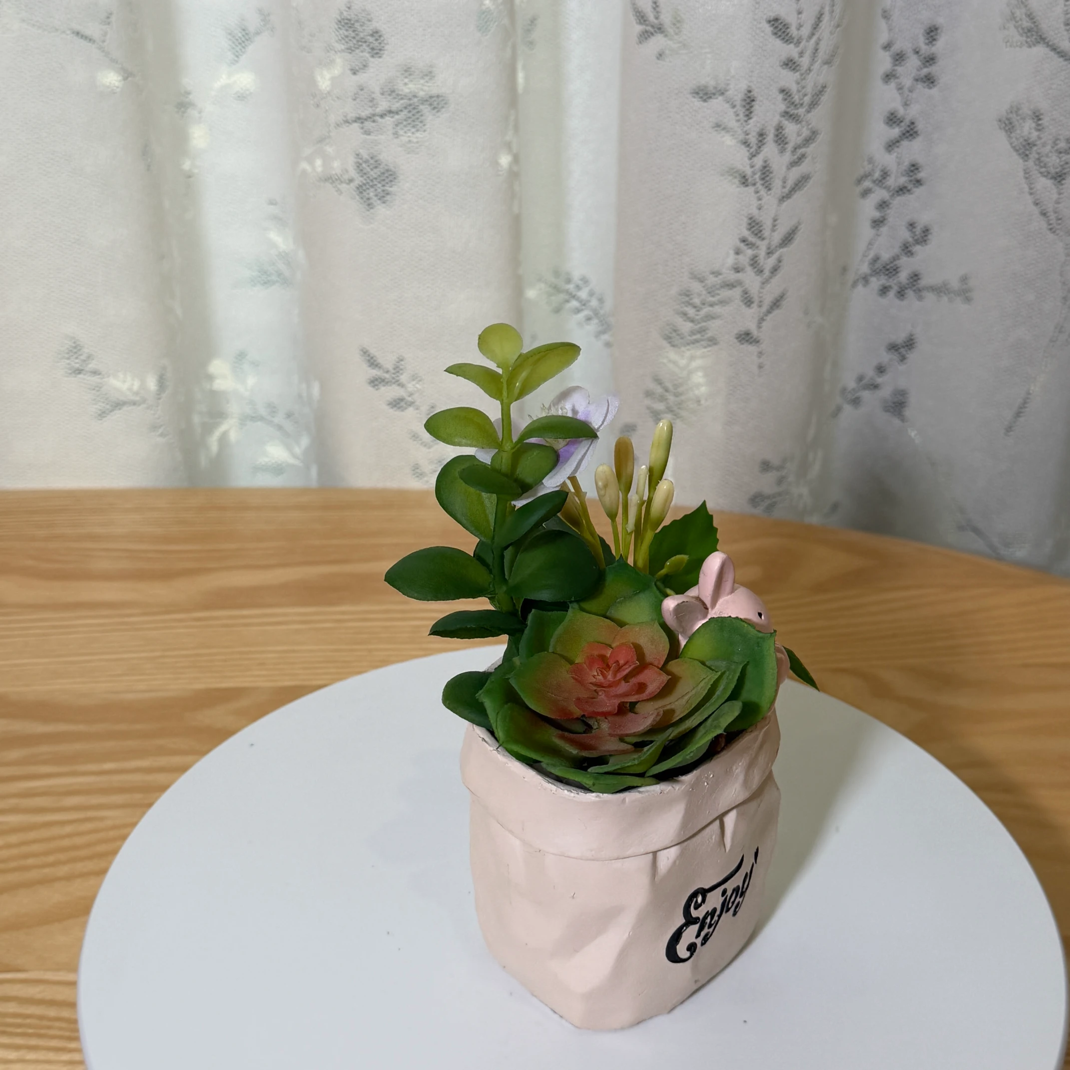 This charming arrangement features a delightful mix of lifelike artificial succulents, eucalyptus foliage, and a delicate pink flower, all nestled in a unique dark grey paper bag-style resin pot. A cute “Lucky” puppy figurine peeks out, adding a warm, whimsical touch. Filled with decorative pebbles, this zero-maintenance decor requires no watering or care, making it perfect for desk decor, gifting, or adding a cozy accent to any space.