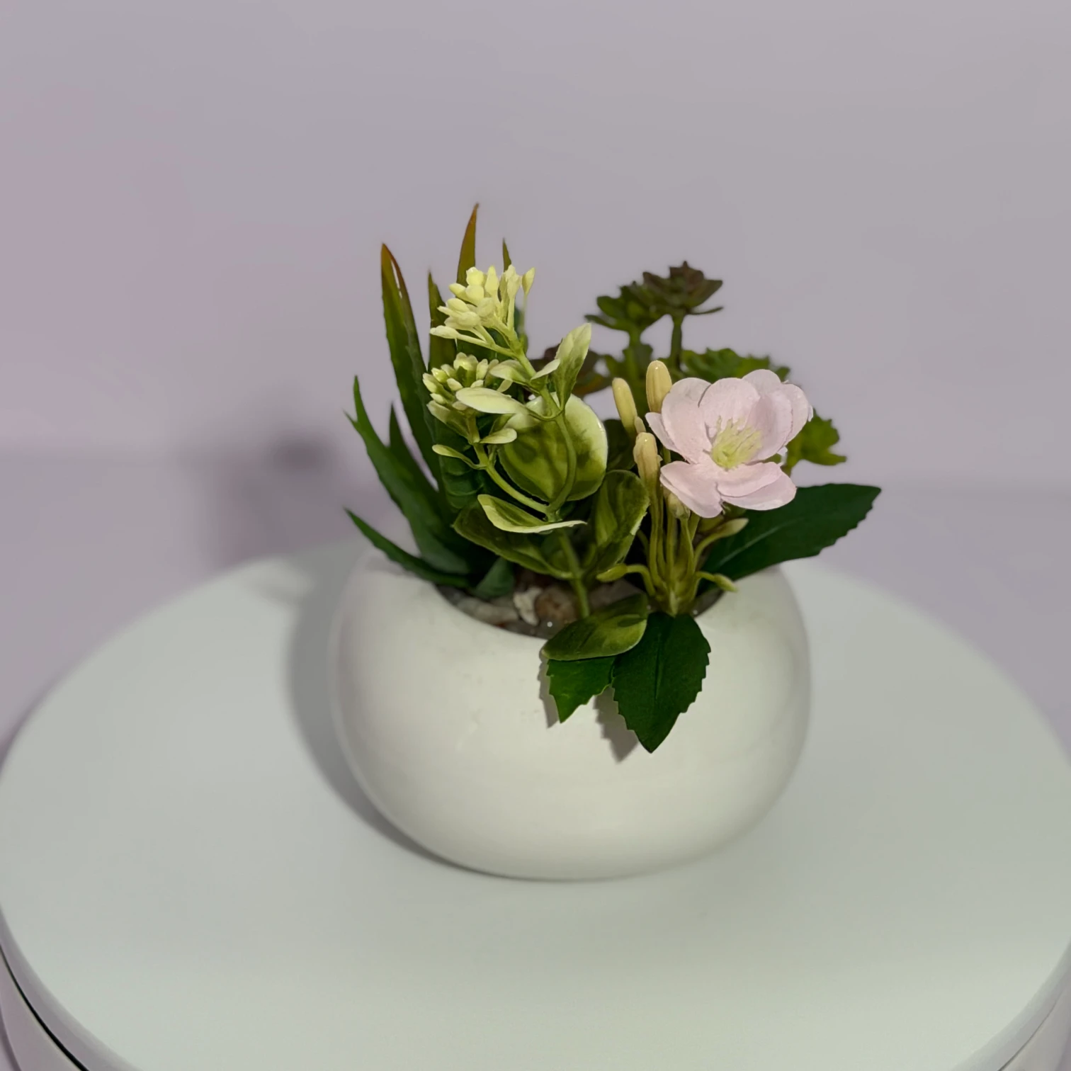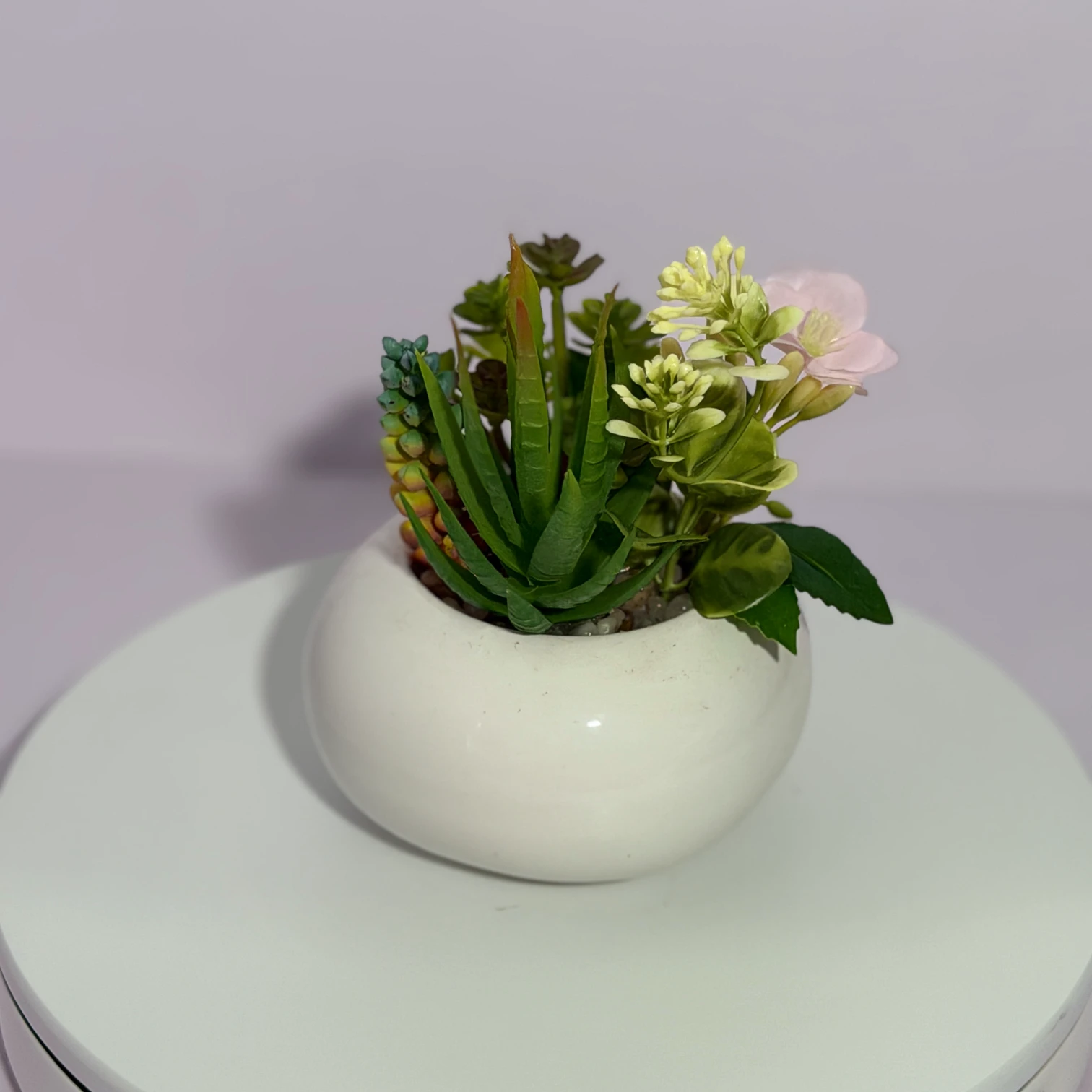 This charming artificial succulent arrangement features a mix of spiky aloe-like plants, round-leaf succulents, gradient-colored succulents, and delicate light pink flowers, all housed in a sleek white glossy round pot. Fully artificial, it requires no watering, sunlight, or maintenance, bringing a fresh, layered natural touch to desks, shelves, or small home corners. Its minimalist design complements modern, cozy, or rustic decor perfectly.