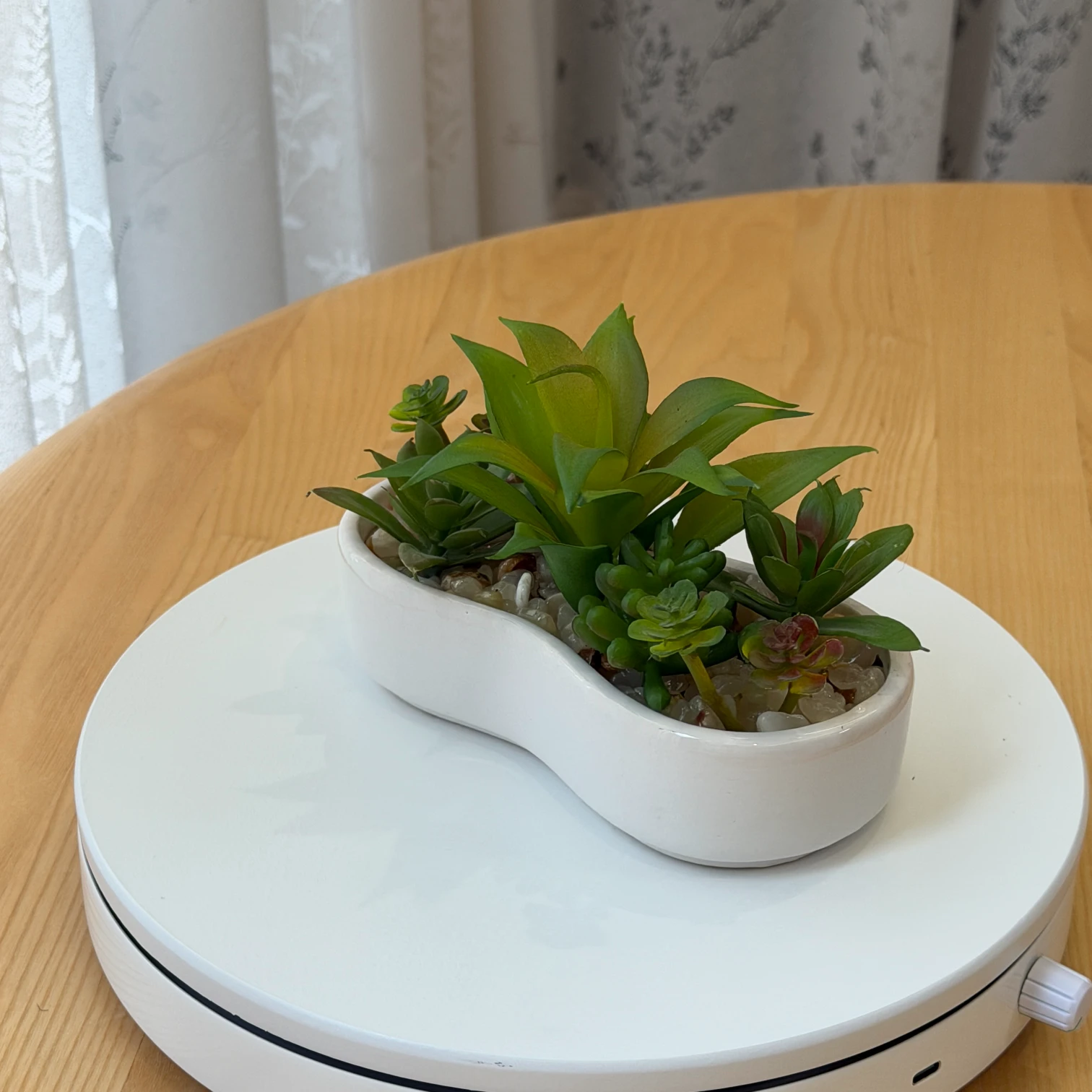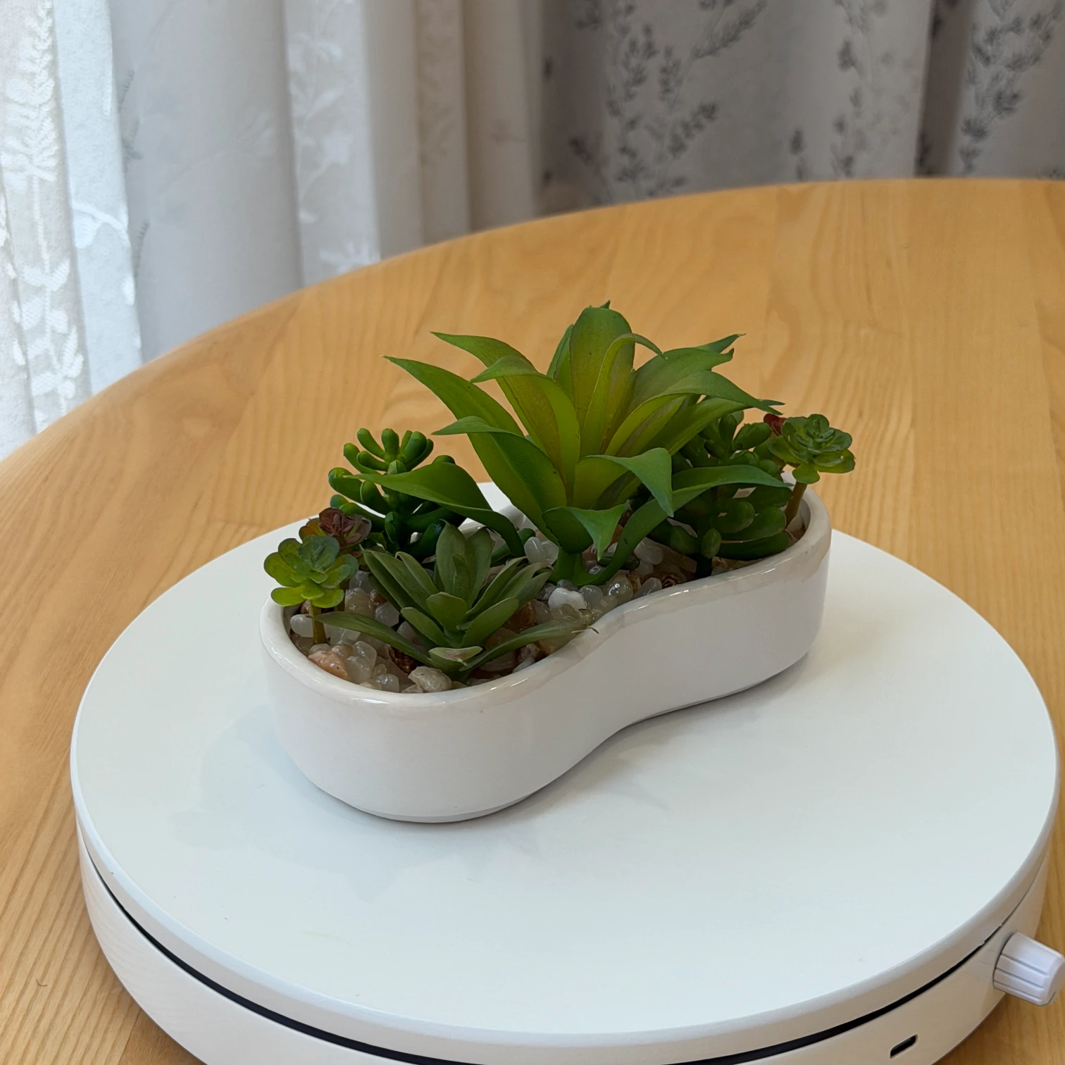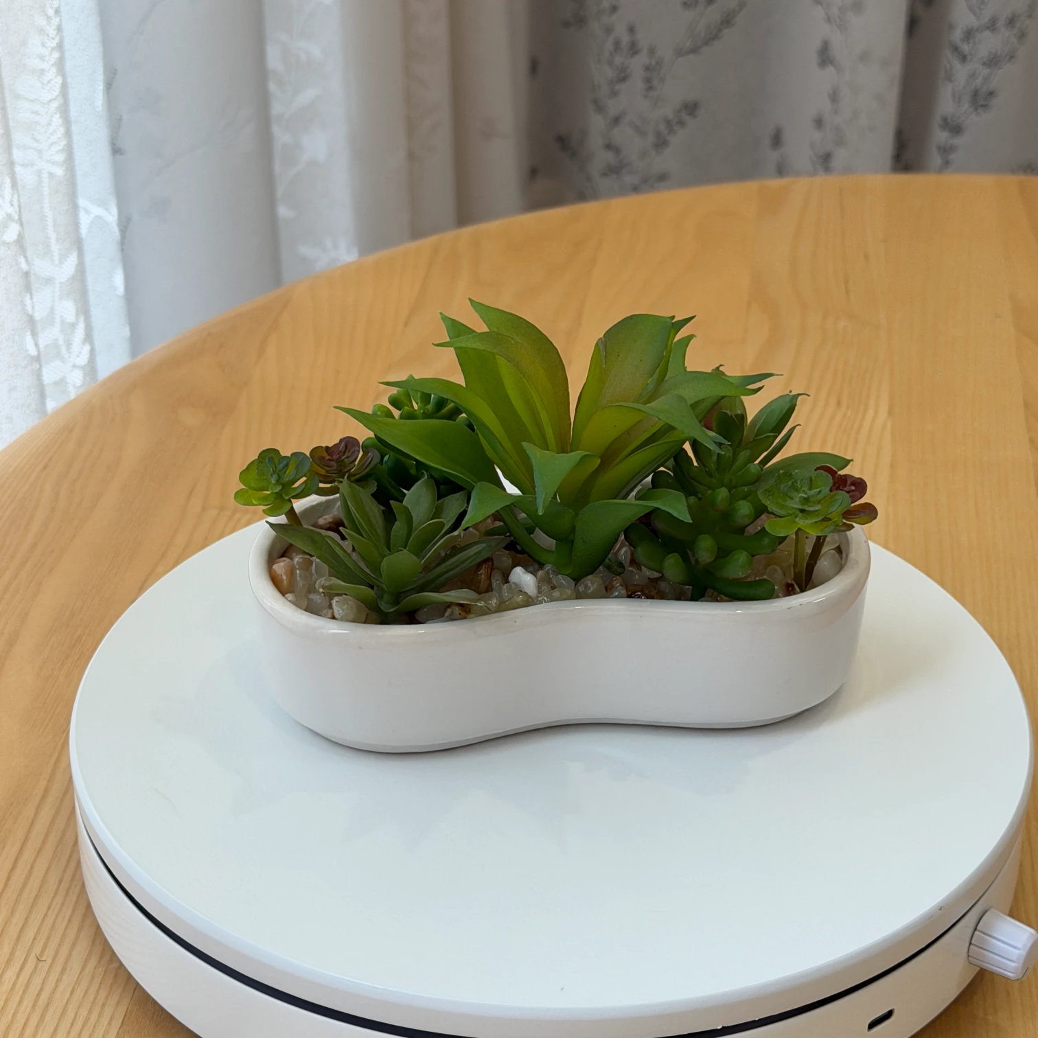 • Pot: Smooth kidney-shaped white ceramic pot with pebble decoration