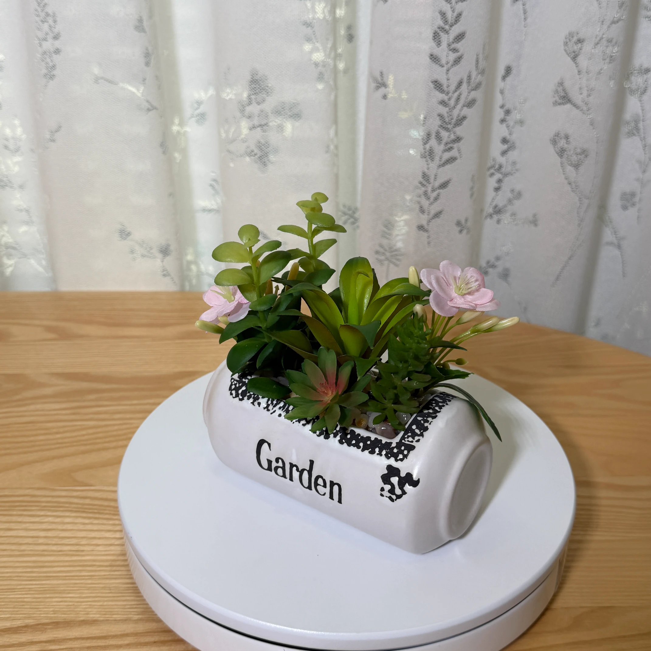 This lush, vibrant arrangement features a curated mix of lifelike artificial succulents, delicate pink flowers, and varied green foliage, all potted in a charming white ceramic planter printed with the word “Garden”. The pot has a rustic, distressed black edge detail, adding a vintage farmhouse touch. Filled with decorative pebbles, this zero-maintenance decor requires no watering or care, making it perfect for brightening desks, shelves, or any small space.
