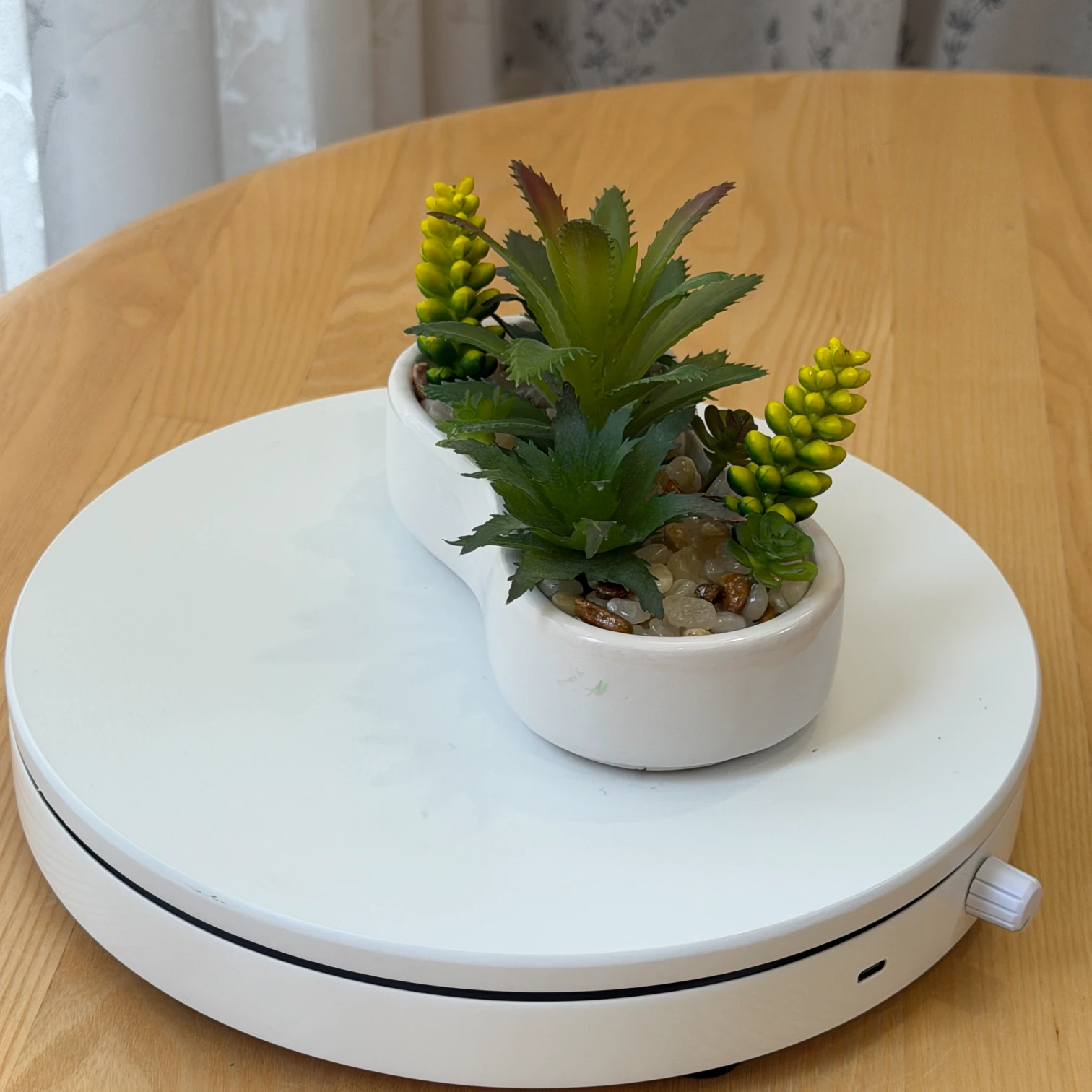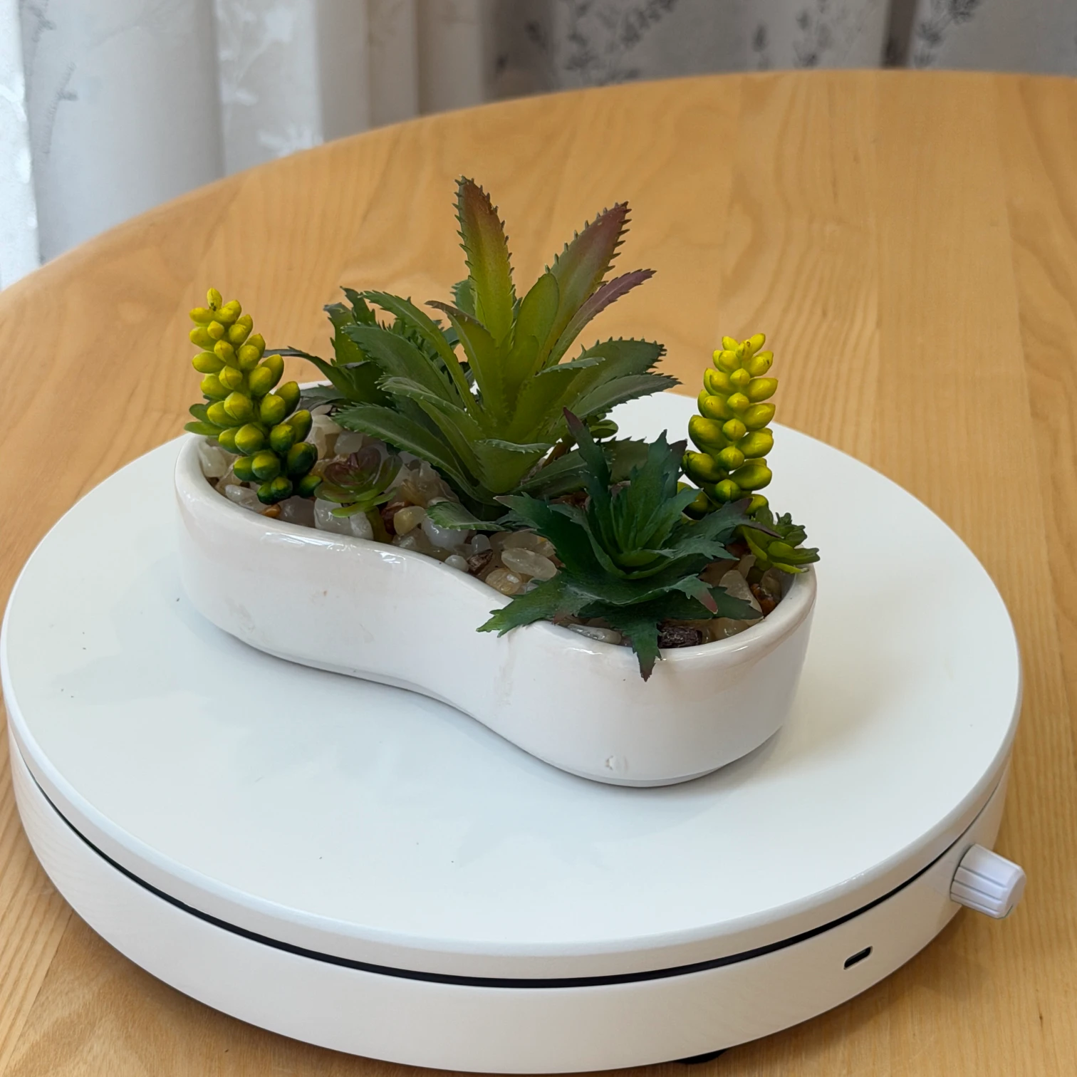 • Pot: Smooth kidney-shaped white ceramic pot with pebble decoration