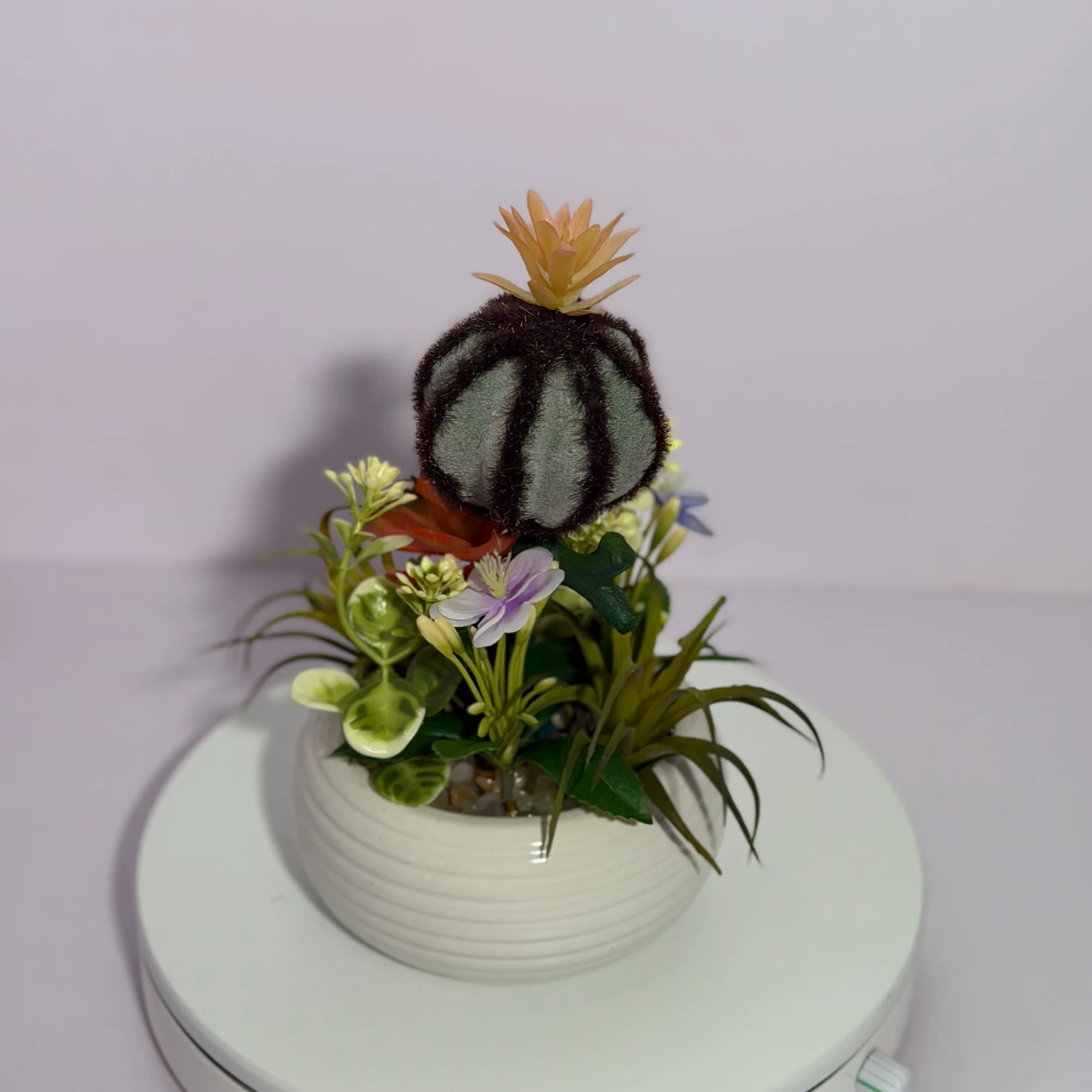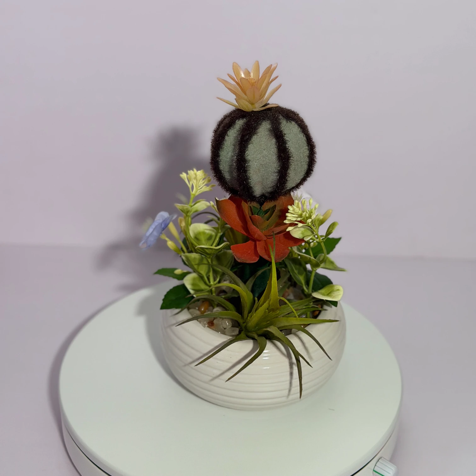 This charming artificial cactus and succulent arrangement features a fuzzy round barrel cactus with an orange bloom, a red rosette succulent, spiky air plant-like foliage, and delicate light blue flowers, all housed in a white ribbed ceramic pot. Fully artificial, it requires no watering, sunlight, or maintenance, bringing a whimsical, desert-inspired natural touch to desks, shelves, or small home corners. Its textured design complements modern, bohemian, or cozy decor perfectly.