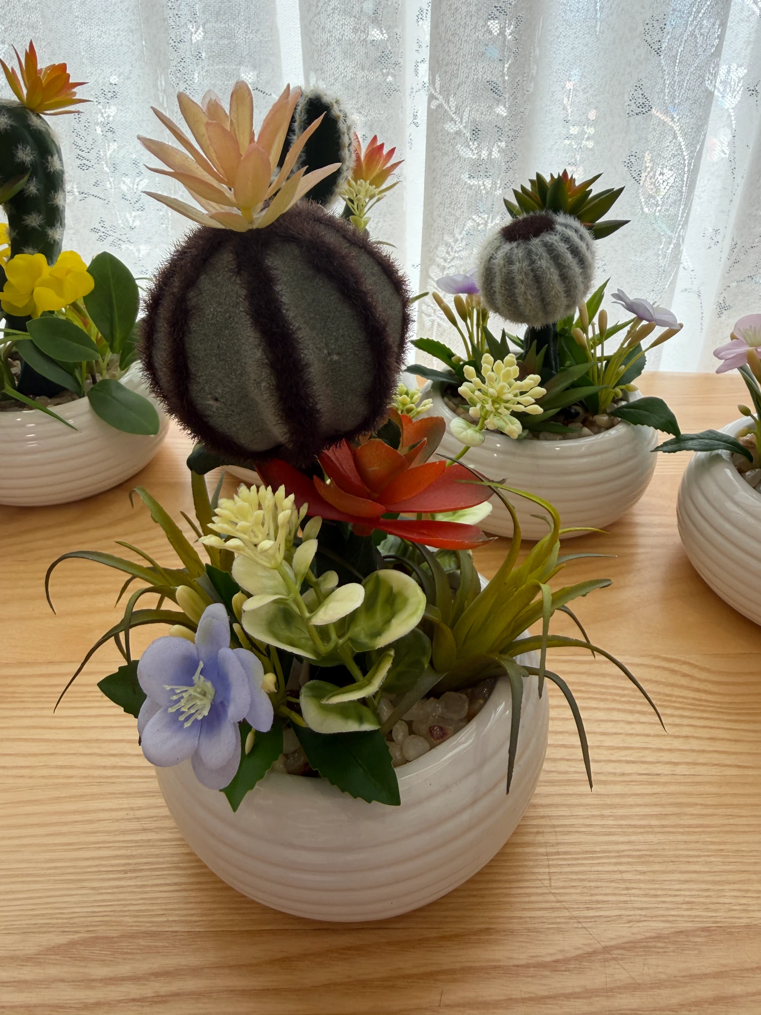 • Key elements: Fuzzy barrel cactus with orange bloom, red rosette succulent, spiky air plant-like foliage, delicate light blue flowers