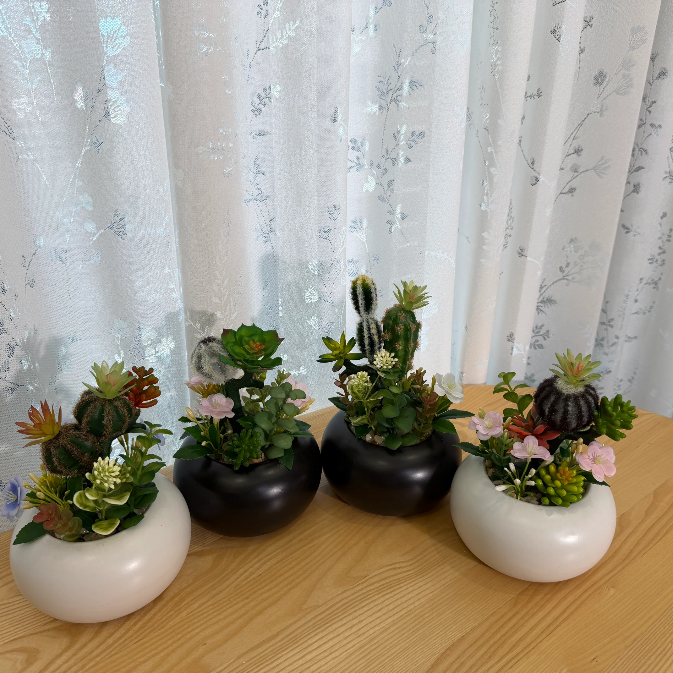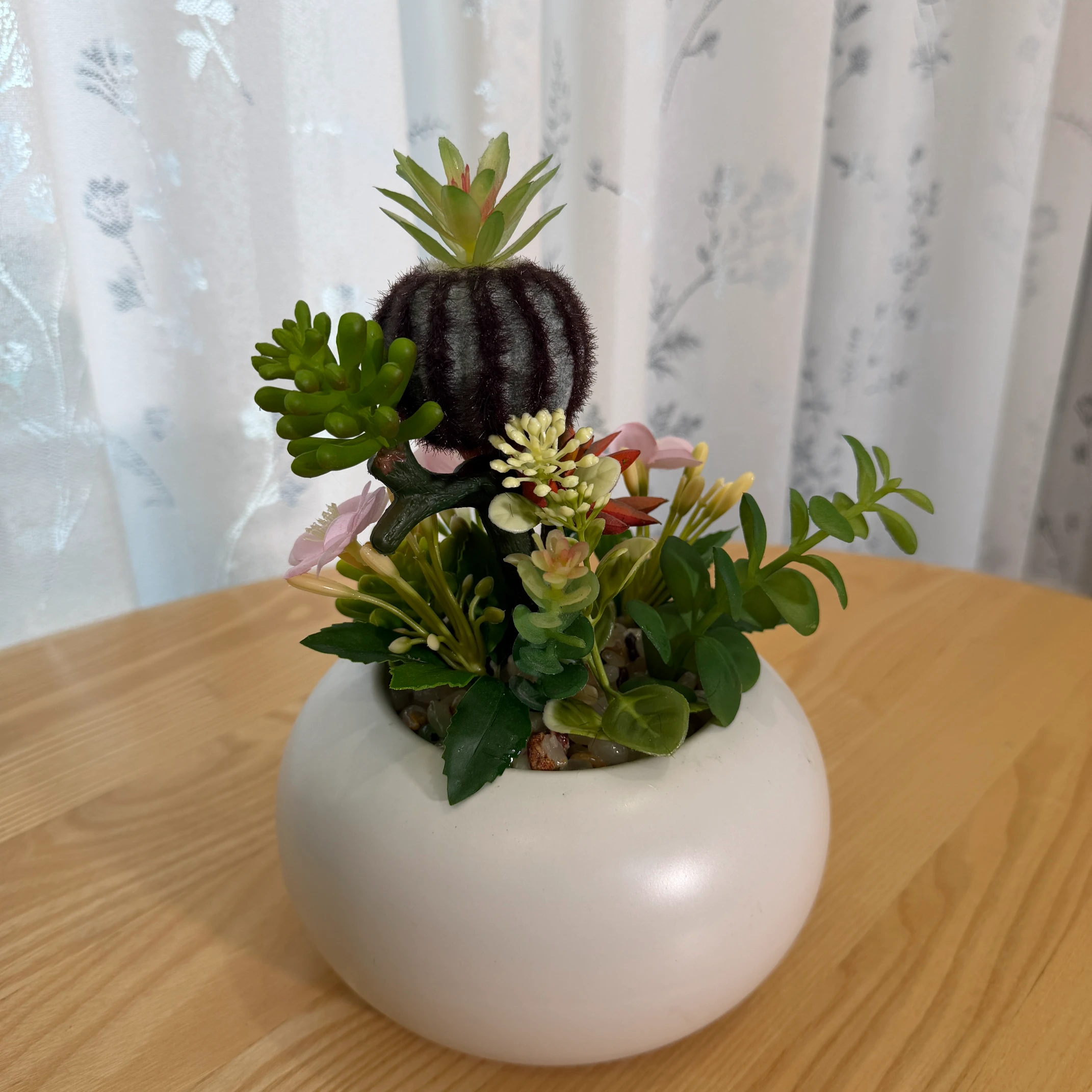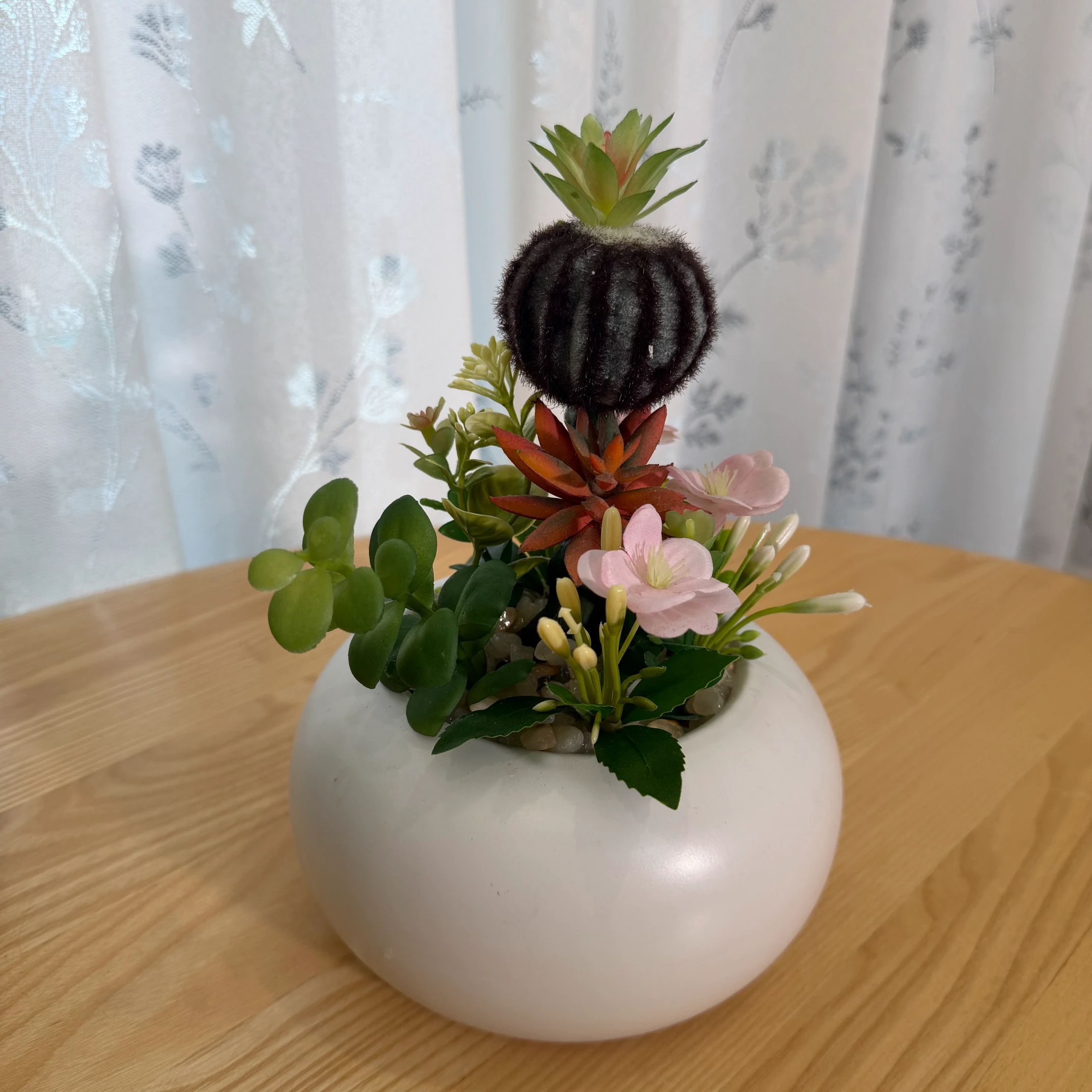 This unique artificial succulent arrangement features a striking mix of plants, including a fuzzy dark purple cactus, vibrant greenery, and delicate pink flowers. It is housed in a smooth, glossy white round pot. Fully artificial, it requires no watering, sunlight, or maintenance, bringing a bold natural touch and modern style to desks, tables, or home corners.