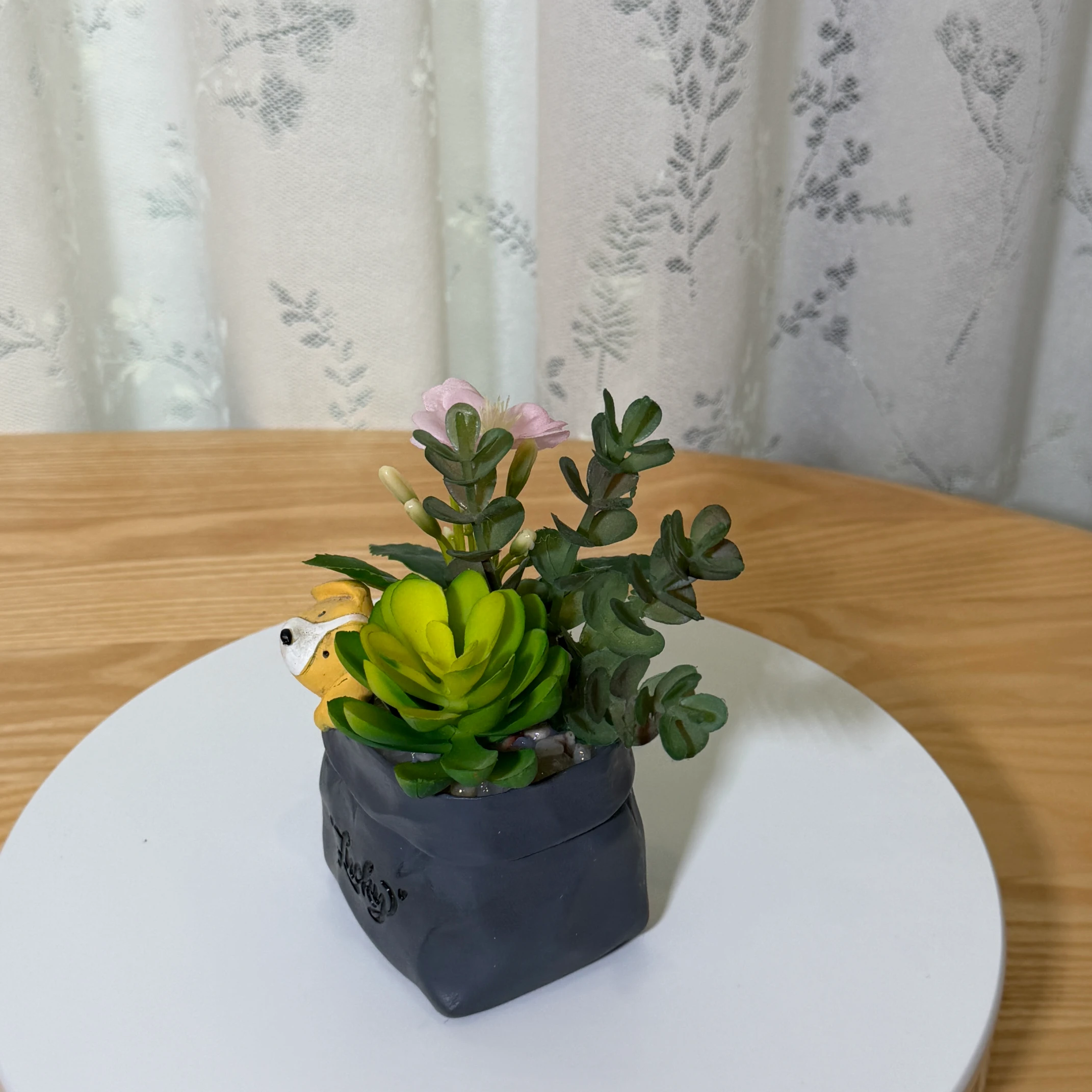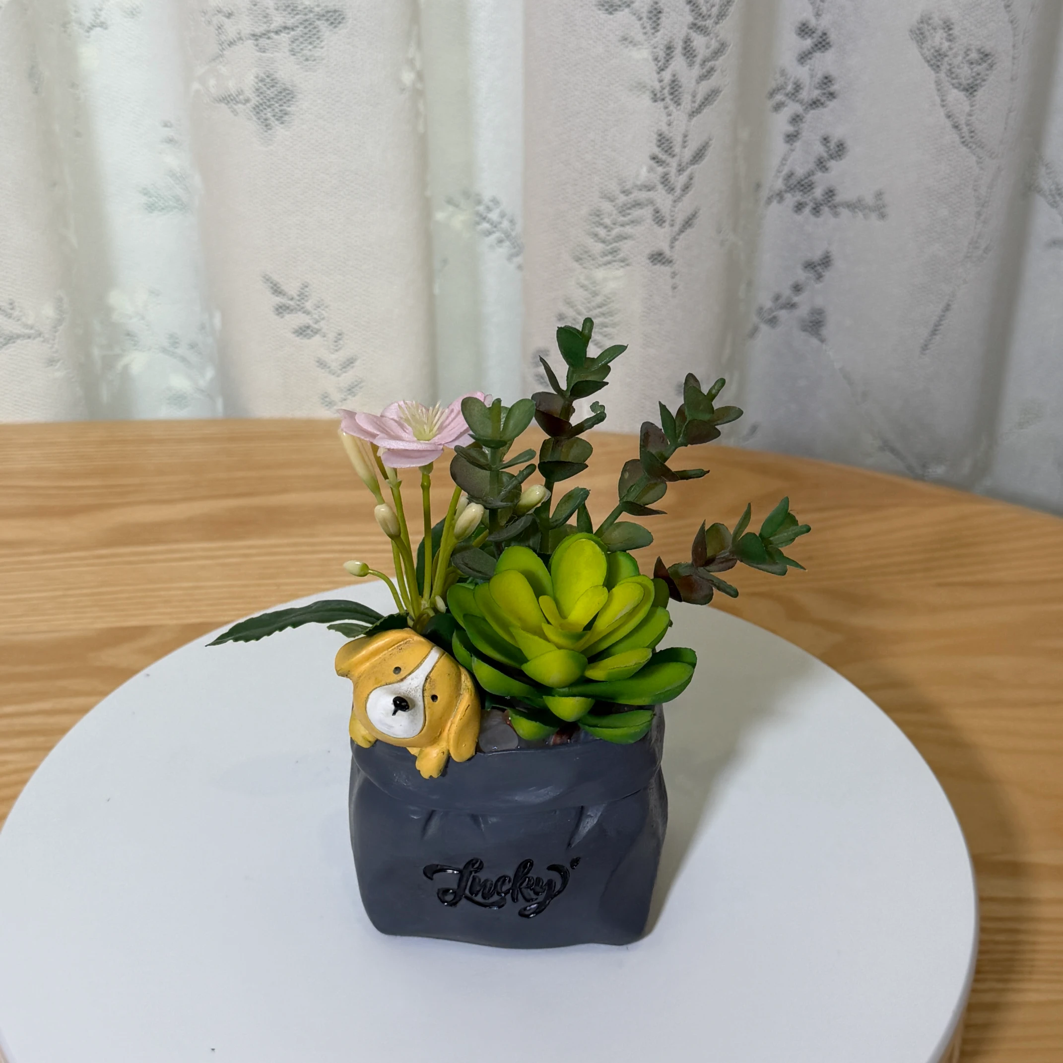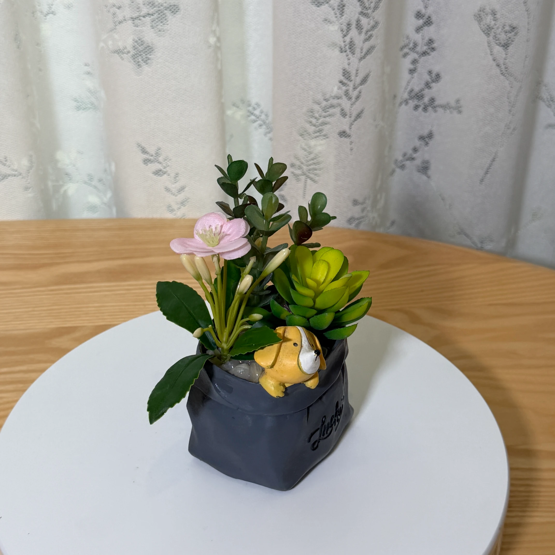 This charming arrangement features a delightful mix of lifelike artificial succulents, eucalyptus foliage, and a delicate pink flower, all nestled in a unique dark grey paper bag-style resin pot. A cute “Lucky” puppy figurine peeks out, adding a warm, whimsical touch. Filled with decorative pebbles, this zero-maintenance decor requires no watering or care, making it perfect for desk decor, gifting, or adding a cozy accent to any space.