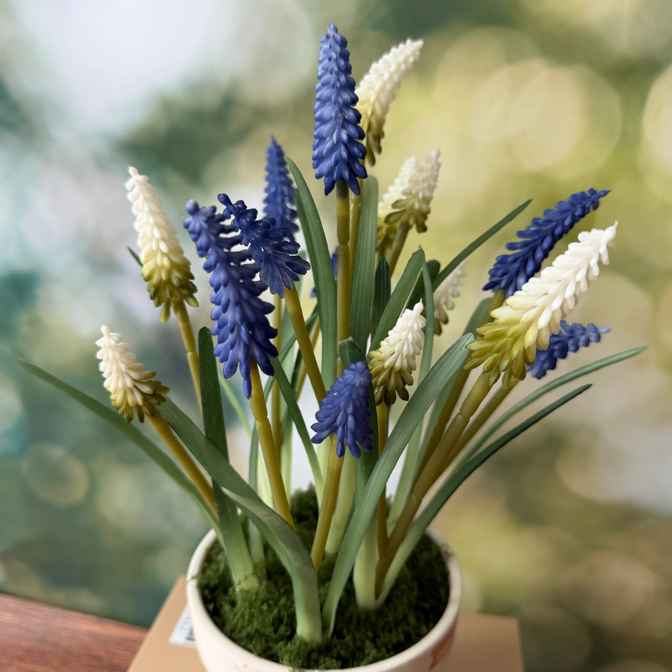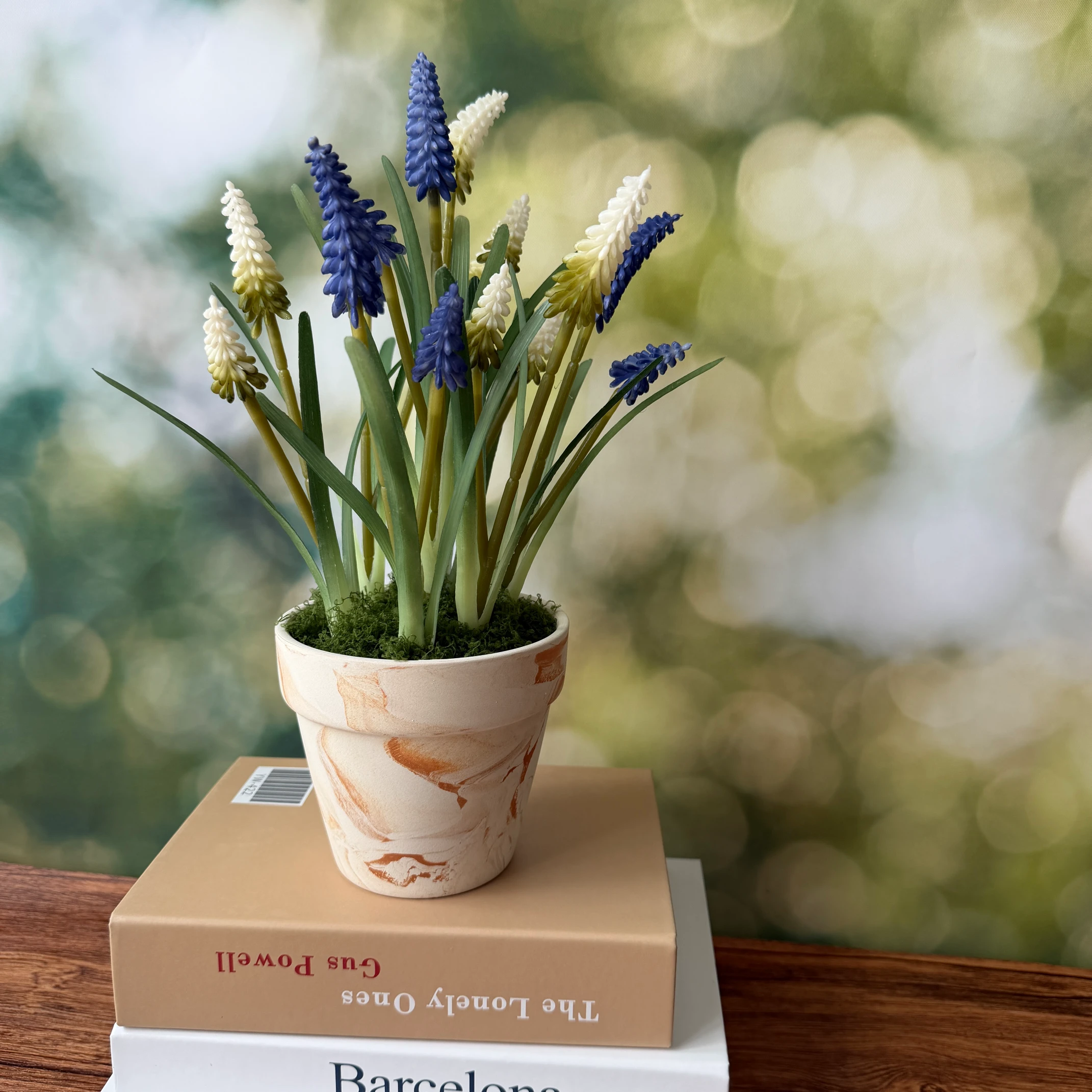 - Material: High-quality synthetic muscari blooms, flexible plastic stems, marbled terracotta pot, preserved moss