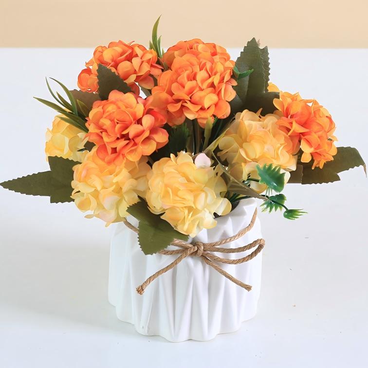 Elegant set of 5 artificial hydrangea potted arrangements, featuring lifelike full-bloom hydrangea clusters in 5 versatile colorways: soft pink, pink & cream, orange & yellow, mauve & pink, and white & pink. Each arrangement is paired with realistic green foliage, potted in a chic white ruffled ceramic pot accented with a rustic twine bow, perfect for adding a timeless, romantic touch to desks, shelves, coffee tables, or entryways with zero maintenance.