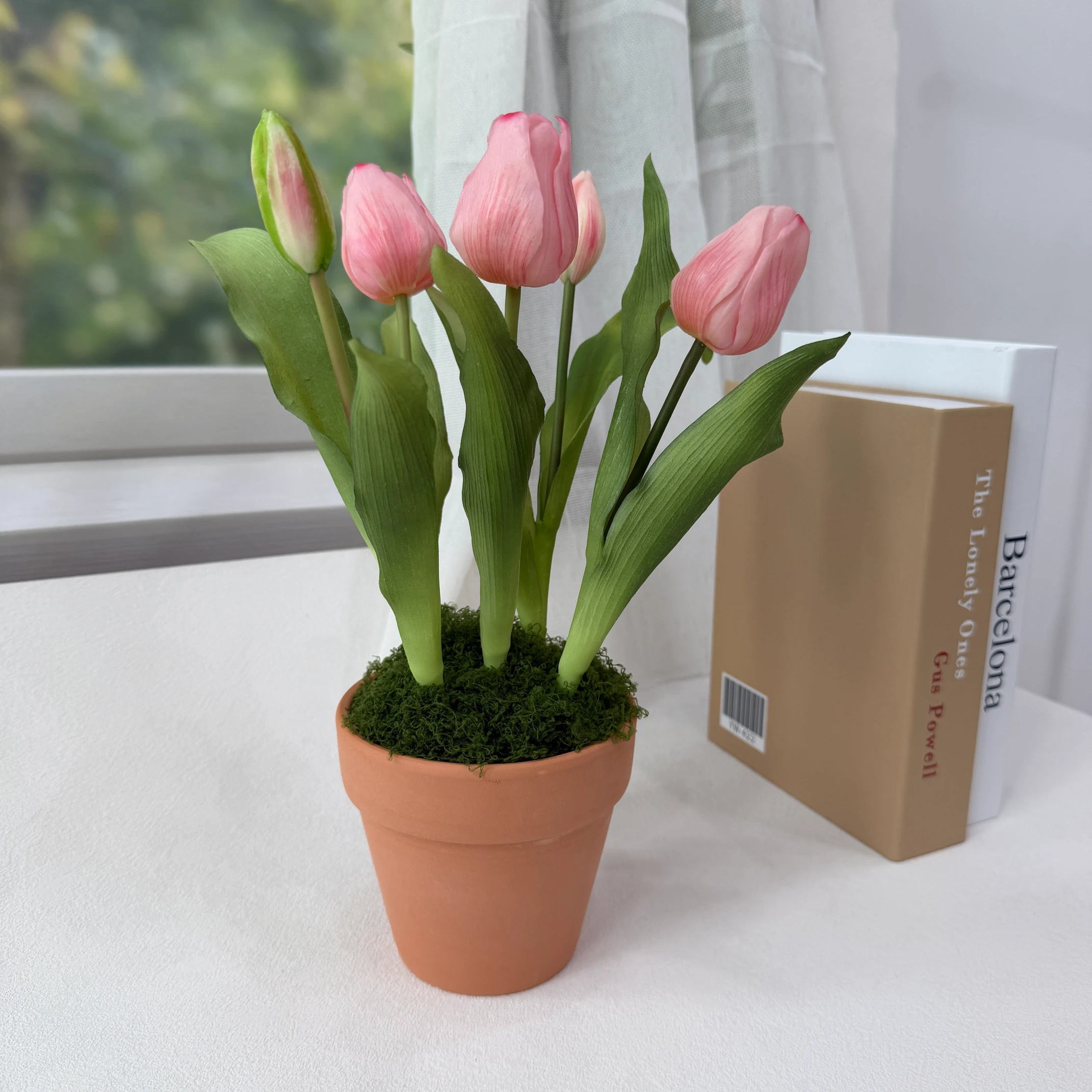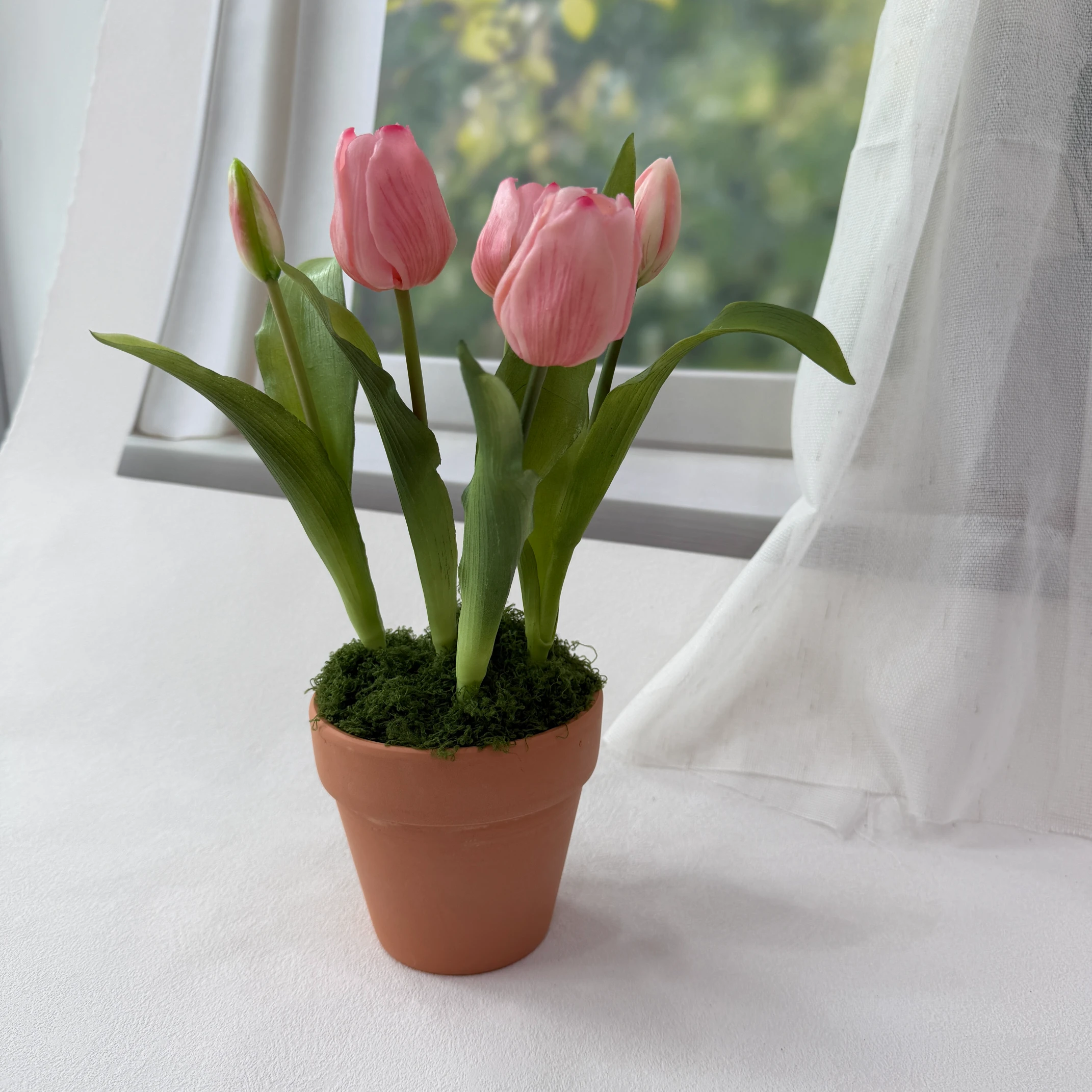 - Material: Premium silk tulip blooms, flexible plastic stems, authentic terracotta pot, preserved moss