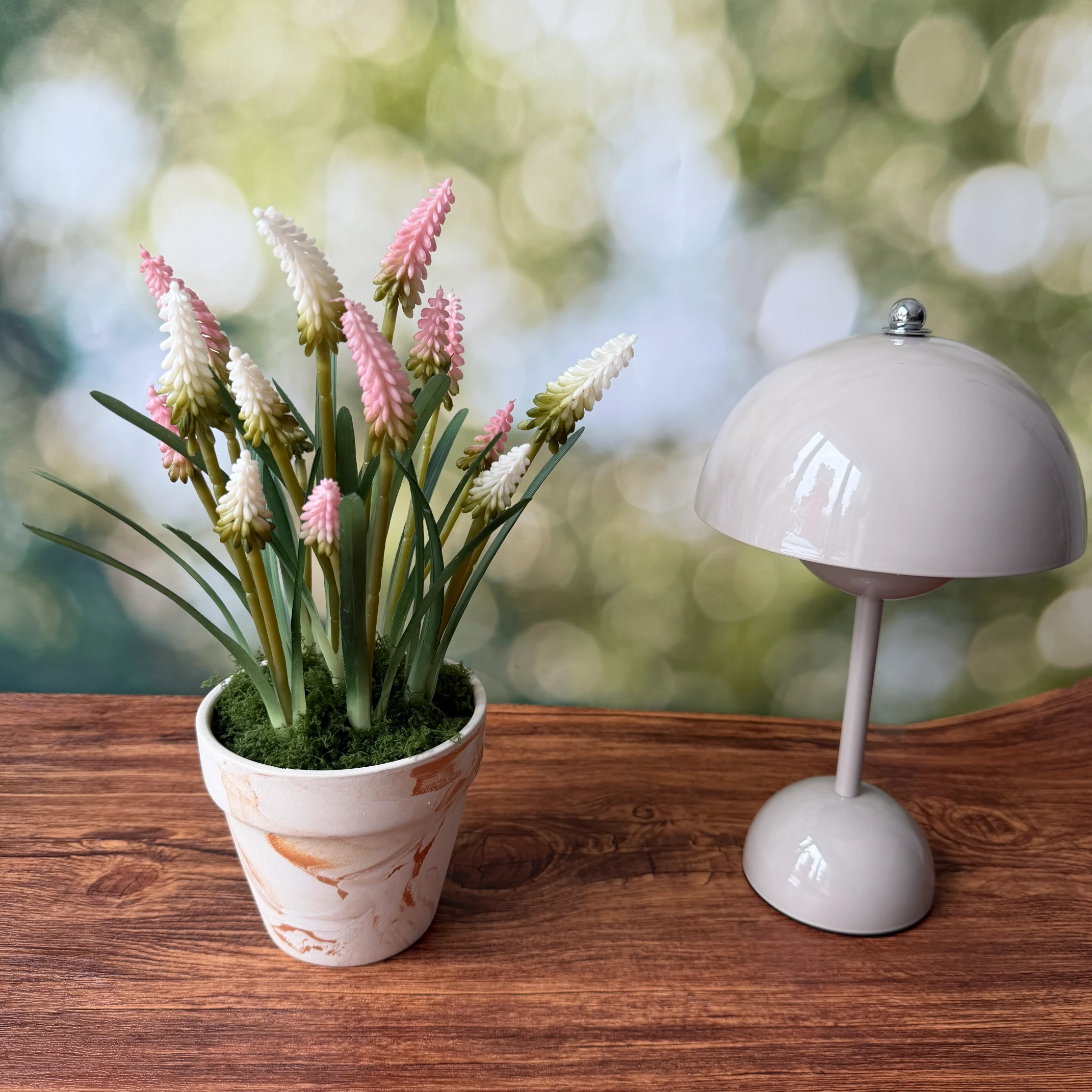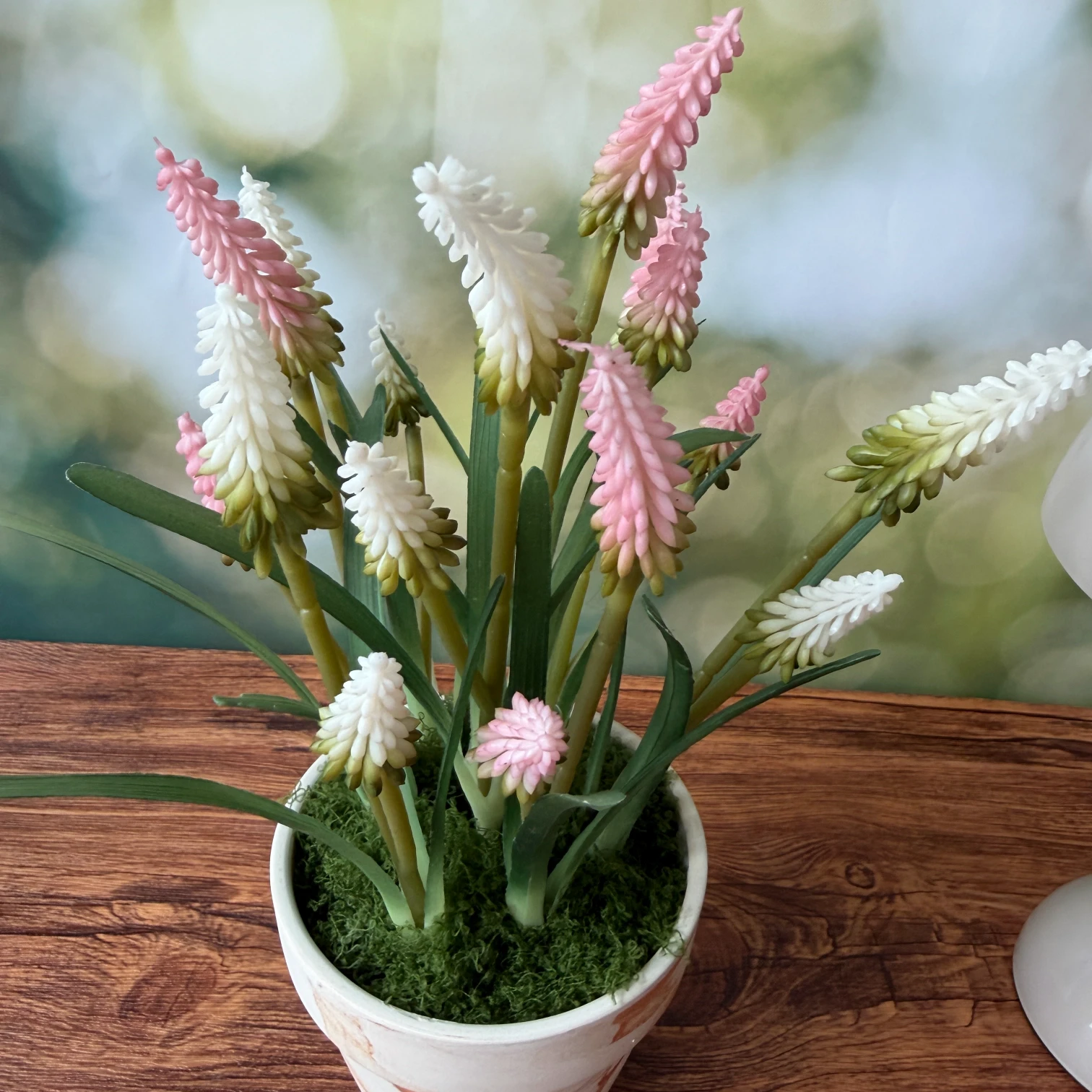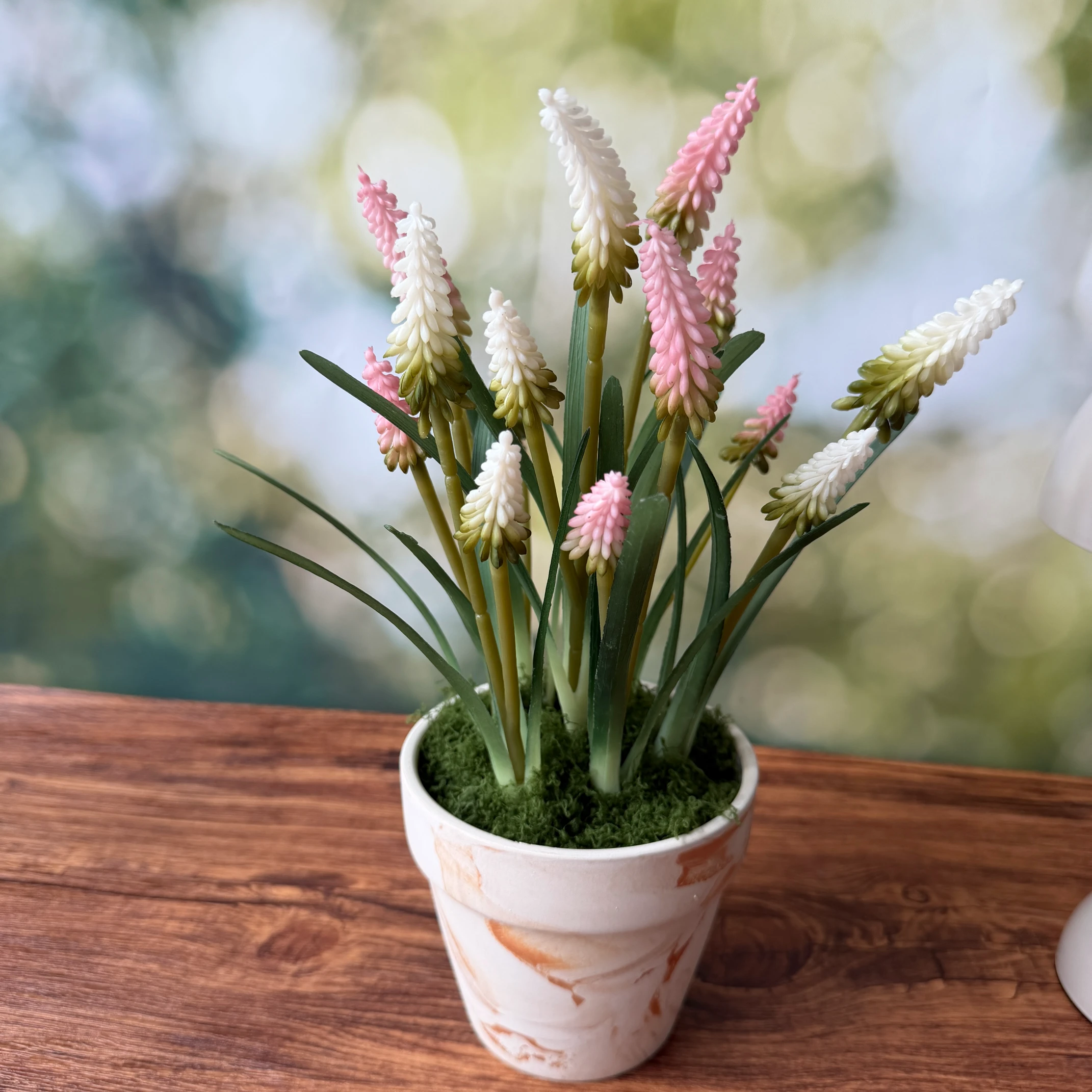 Charming artificial muscari (grape hyacinth) arrangement featuring a lush mix of soft pink and creamy white spiked blooms, paired with long, realistic green leaves, potted in a rustic hand-painted terracotta pot topped with preserved moss. Perfect for bringing a delicate, spring meadow vibe to any tabletop, shelf, or windowsill with zero maintenance.