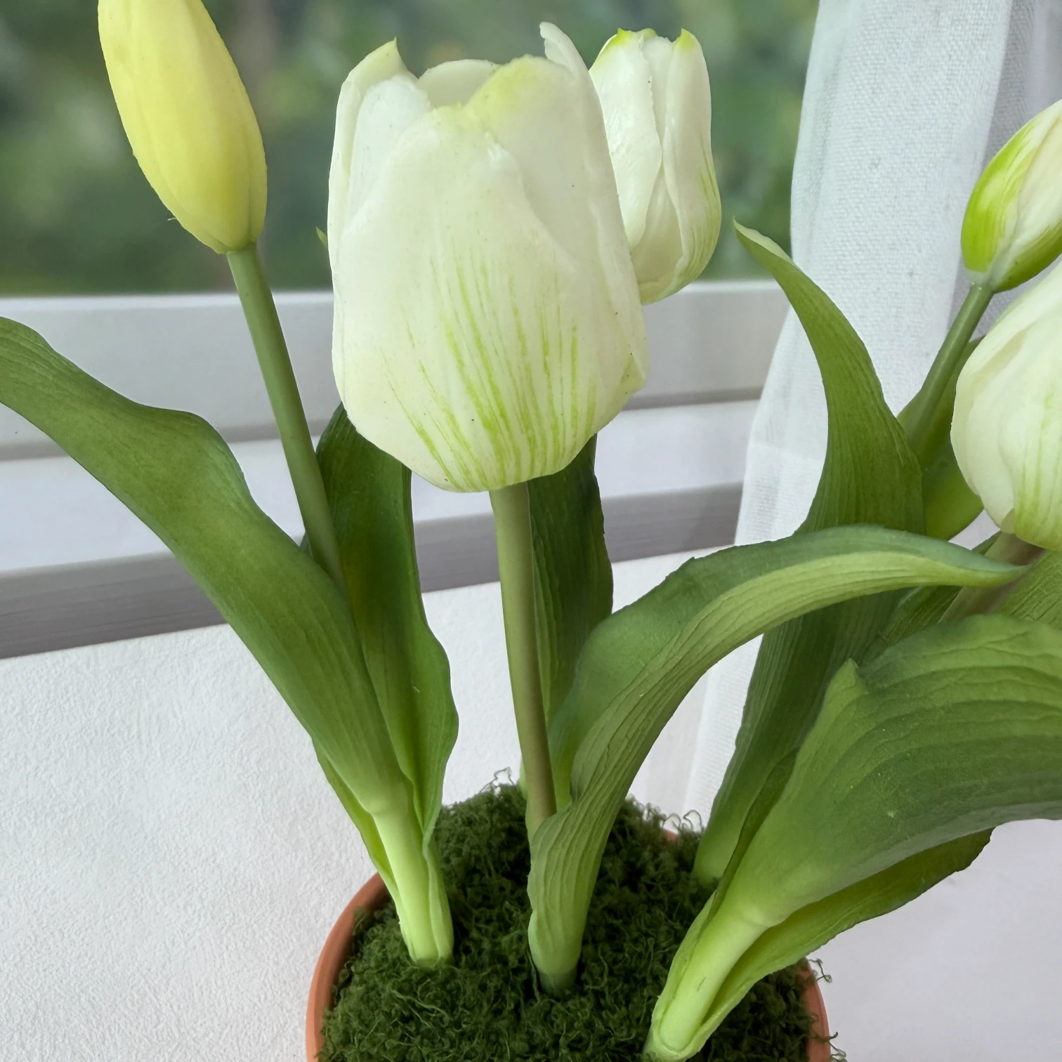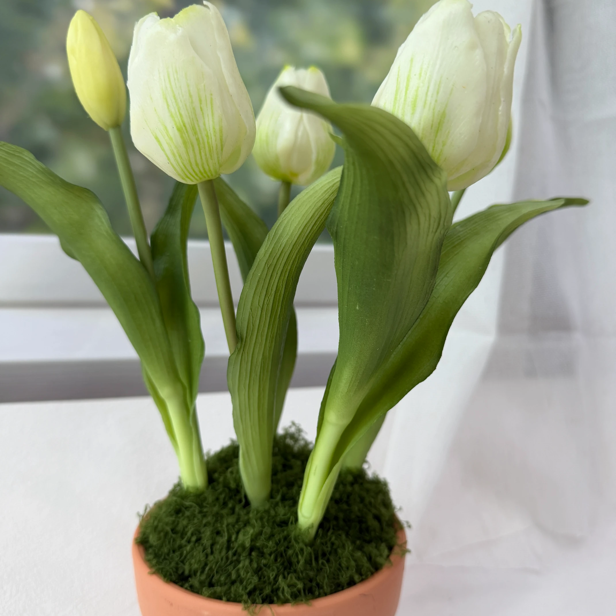 - Material: Premium real-touch silk tulip blooms, flexible plastic stems, authentic terracotta pot, preserved moss