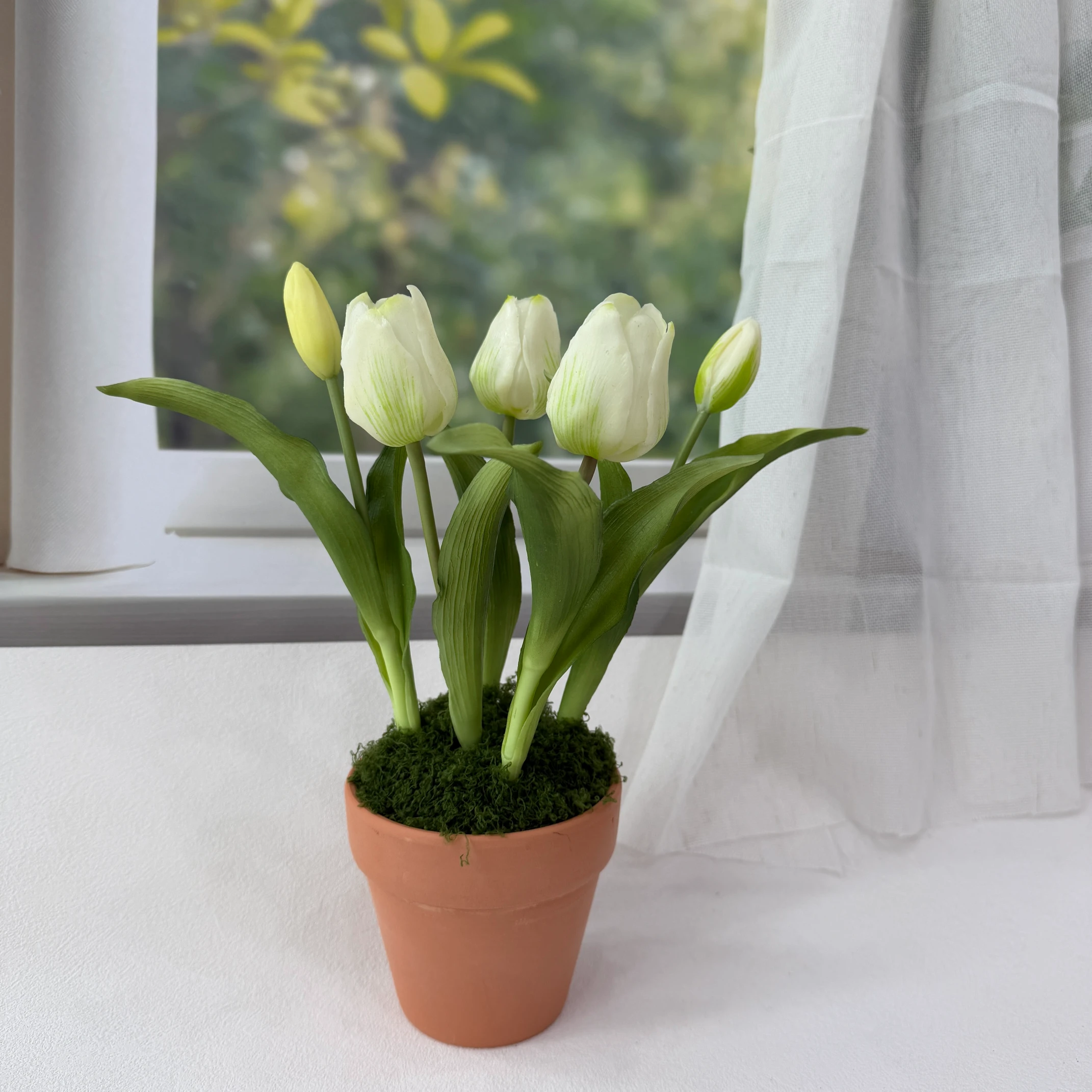 Elegant artificial tulip arrangement featuring delicate white blooms with soft green edges and hints of green in the buds, set atop lush preserved moss in a classic natural terracotta pot. Perfect for bringing a fresh, minimalist spring charm to any windowsill, desk, or bookshelf with zero maintenance.
