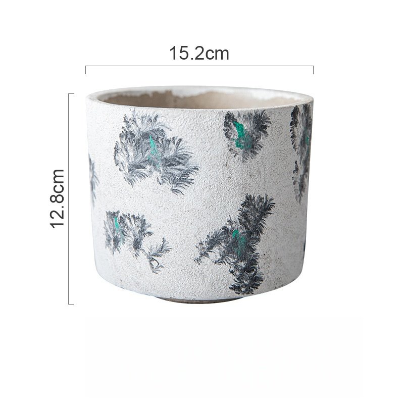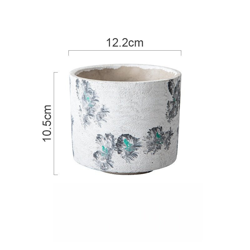 This set of concrete planters features a delicate, hand-painted floral pattern, blending industrial texture with soft, modern botanical charm.