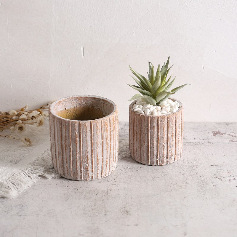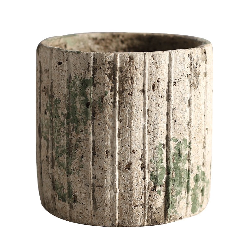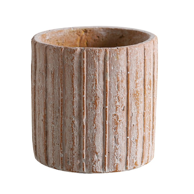 This cylindrical concrete planter features raised vertical ribbed texture, available in two distressed finishes that evoke rustic charm.