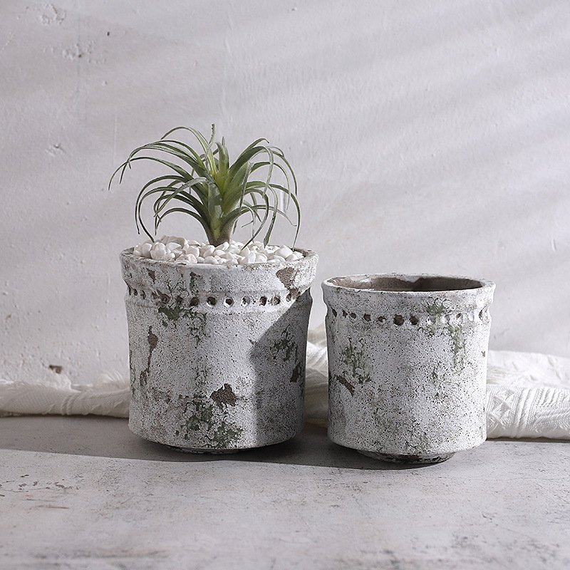 Vintage Beaded Rim Concrete Planter | Mossy Patina Duo
