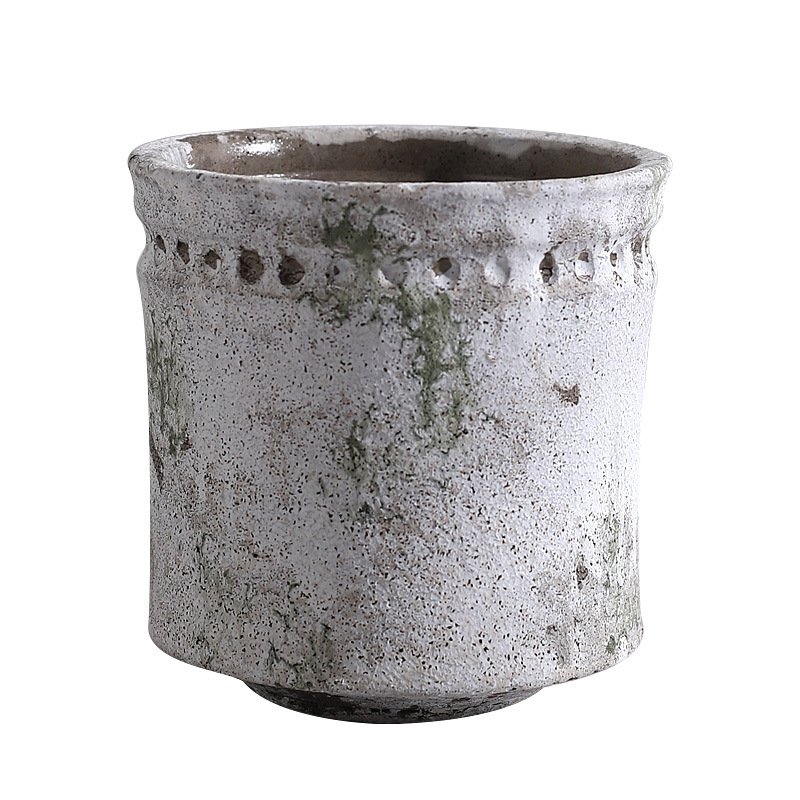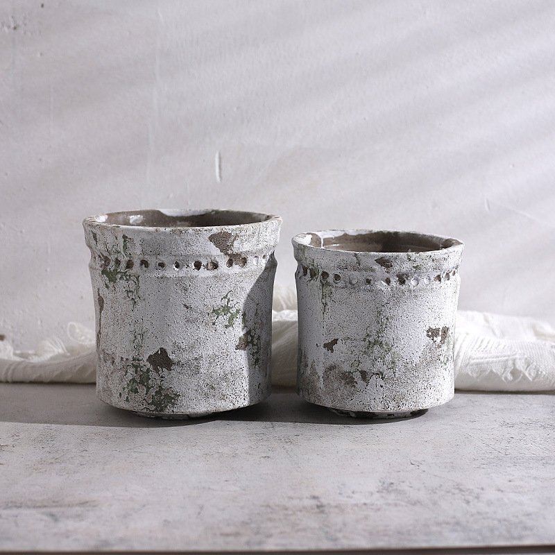 These concrete planters feature a delicate raised beaded rim and weathered, aged finishes, blending antique charm with concrete durability.