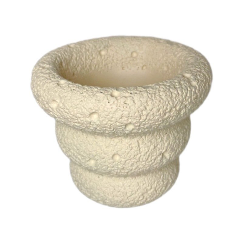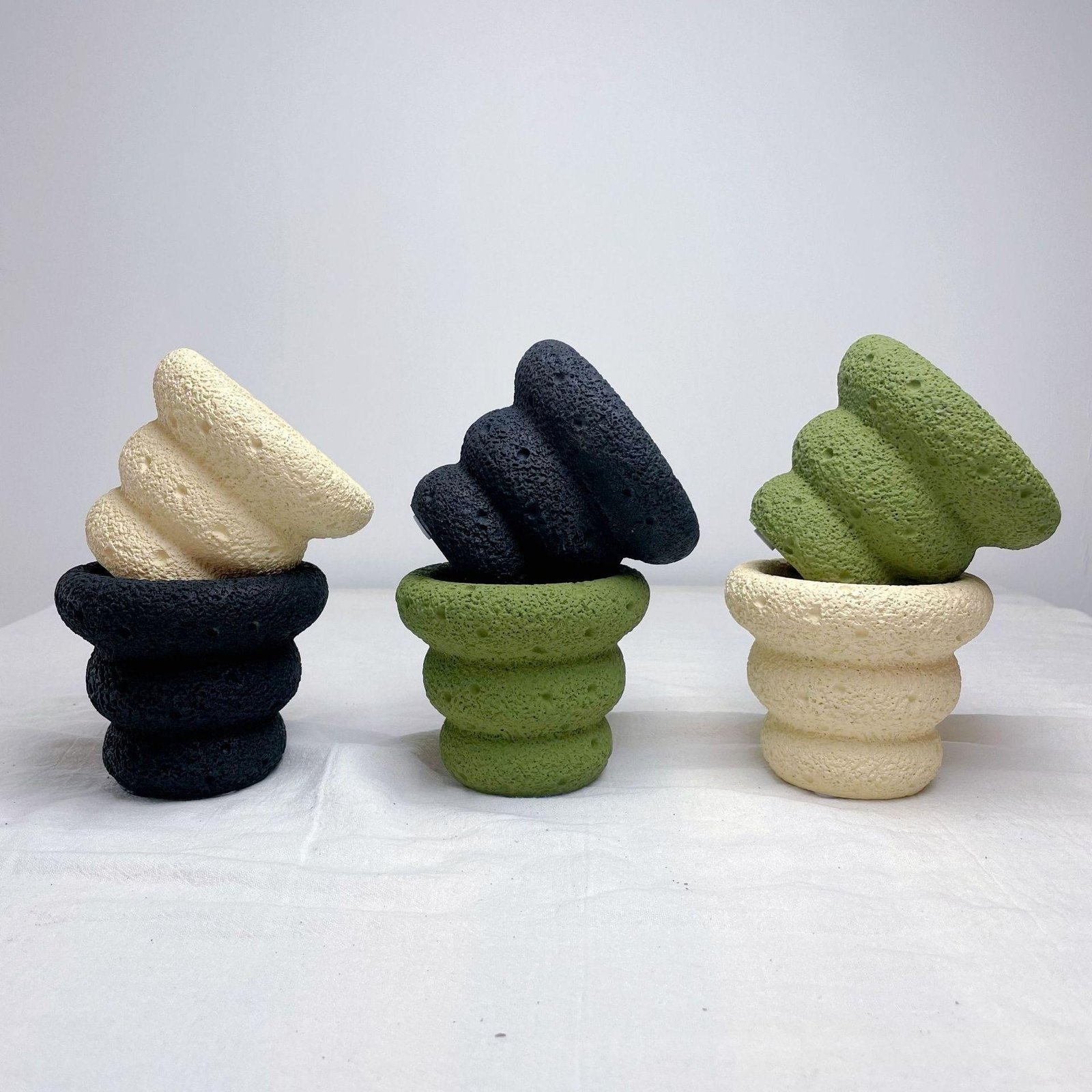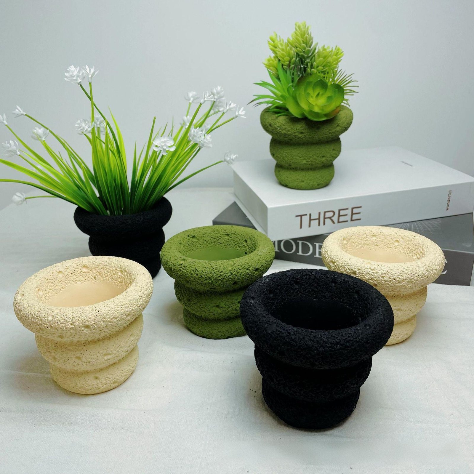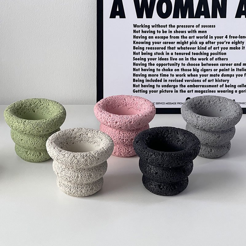 These concrete planters feature a porous volcanic bubble texture and a playful stacked tier design, available in six vibrant matte colors.